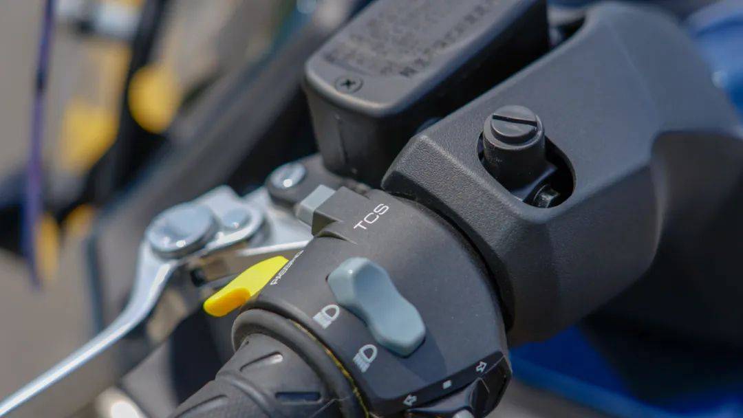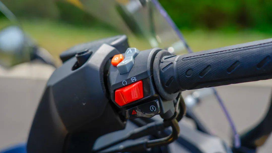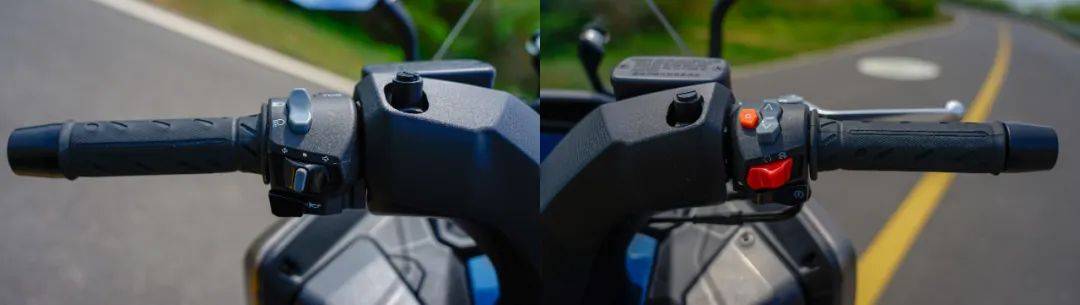 手把開關(guān)與大多數(shù)光陽車款保持一致,做工質(zhì)感以及按鍵手感都比常規(guī)通用件好上不少,左側(cè)手把除了常規(guī)按鍵以外,在超車燈旁邊還有TCS控制按鈕,長(zhǎng)按可控制TCS系統(tǒng)開關(guān),右側(cè)手把集成了多功能儀表控制按鈕,操作邏輯也非常簡(jiǎn)單,紅色按鈕為熄火開關(guān),暫時(shí)停車熄火再也不用去擰鑰匙了,雙閃同樣與啟動(dòng)開關(guān)集成在一起,往左按就是雙閃,往右按就是車輛啟動(dòng)。