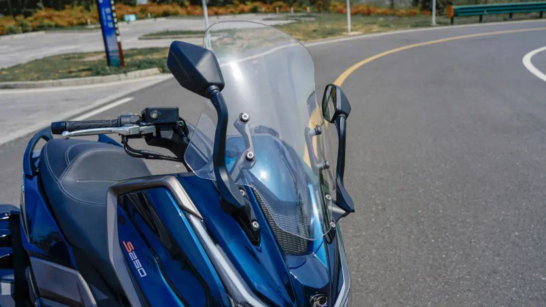 風(fēng)擋相比S350的面積更大,采用鋁合金風(fēng)擋支架,看起來就十分扎實(shí),同時(shí)騎行中也能提供良好的風(fēng)阻保護(hù)效果;后視鏡同樣采用鋁合金材質(zhì),前置后視鏡在外觀上能為整車顏值加分,而在實(shí)用層面也并非“花架子”,擁有良好的可視性,并且考慮到車輛在窄路的通過能力,這套后視鏡也具備折疊功能。