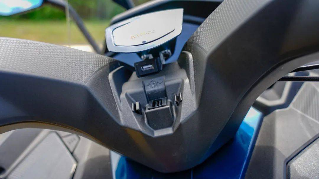 兩側(cè)剎車牛角均具備四段可調(diào)功能,以適應(yīng)不同使用人群,手把中間“KYMCO”蓋下方如同多數(shù)光陽車款一樣設(shè)計(jì)有USB接口以及理線槽,使用起來非常方便。