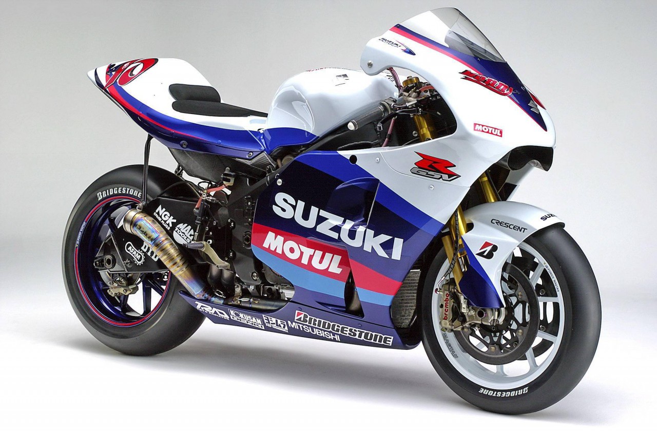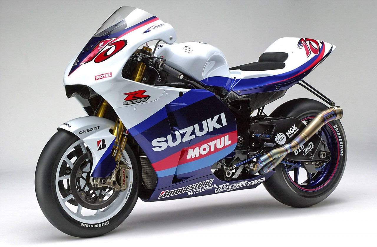 下面的圖片,Suzuki 第一代的 MotoGP 工廠賽車、搭載 V 型四氣缸發(fā)動機(jī)的 2005&apos GSV-RR(資料圖片)。