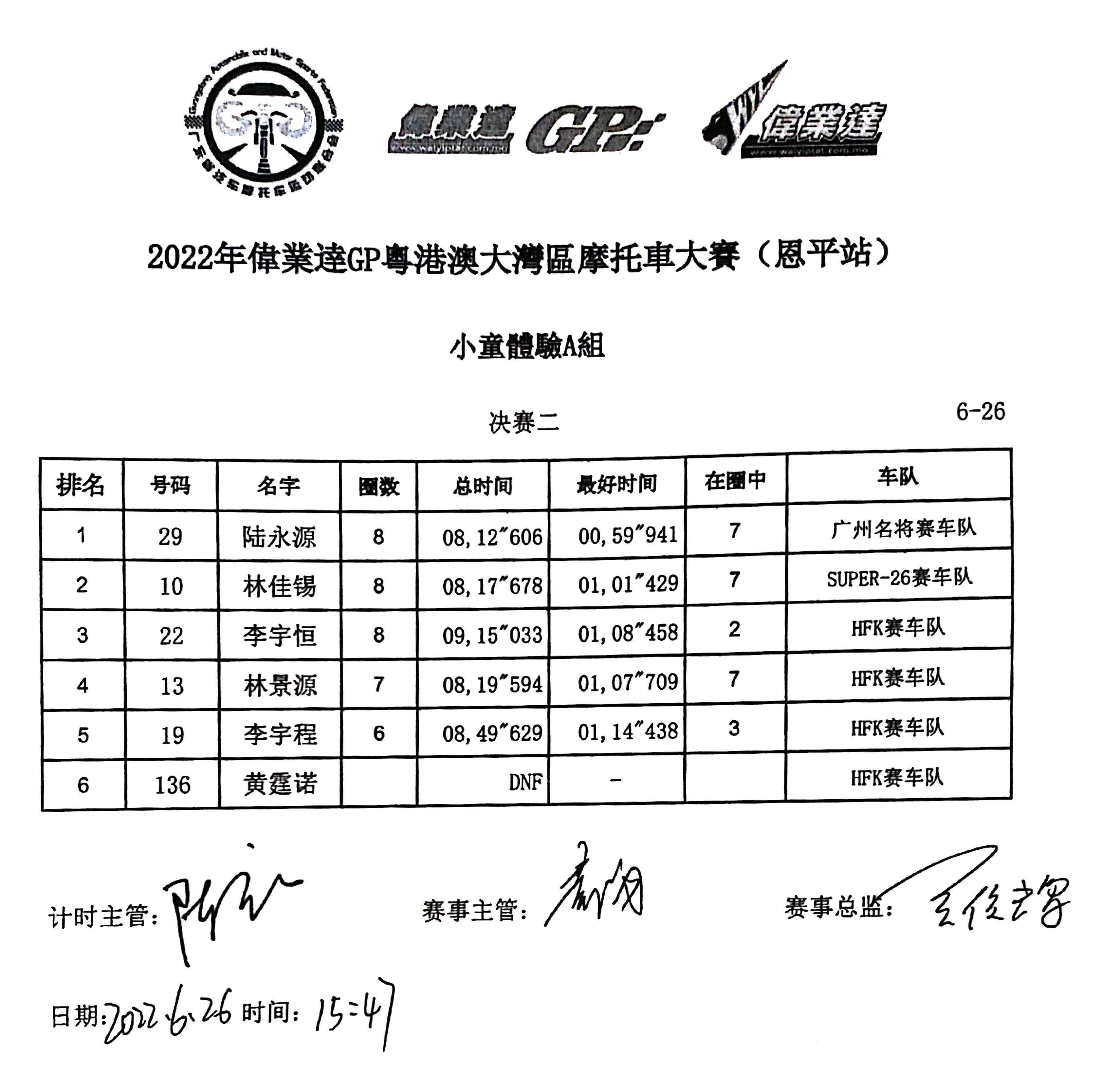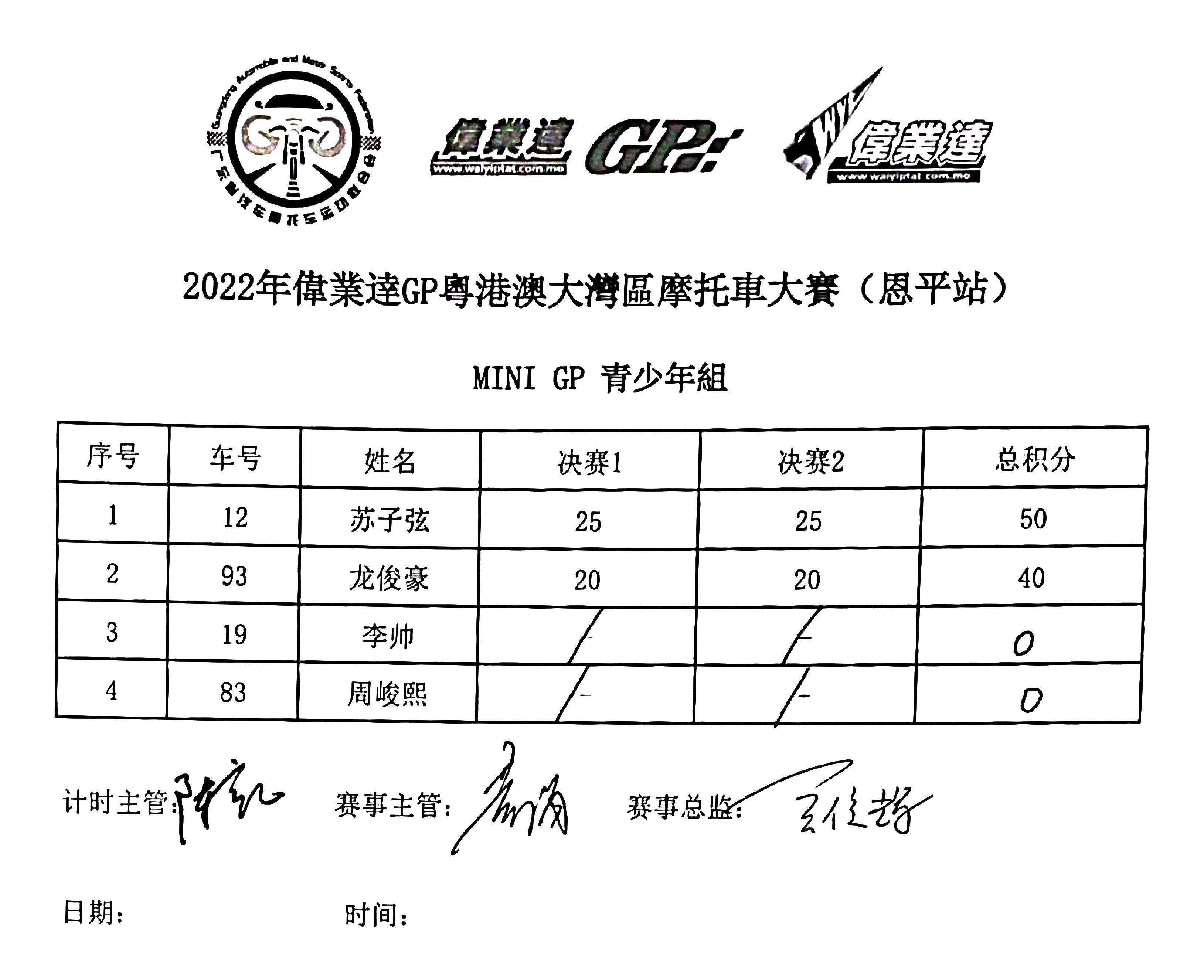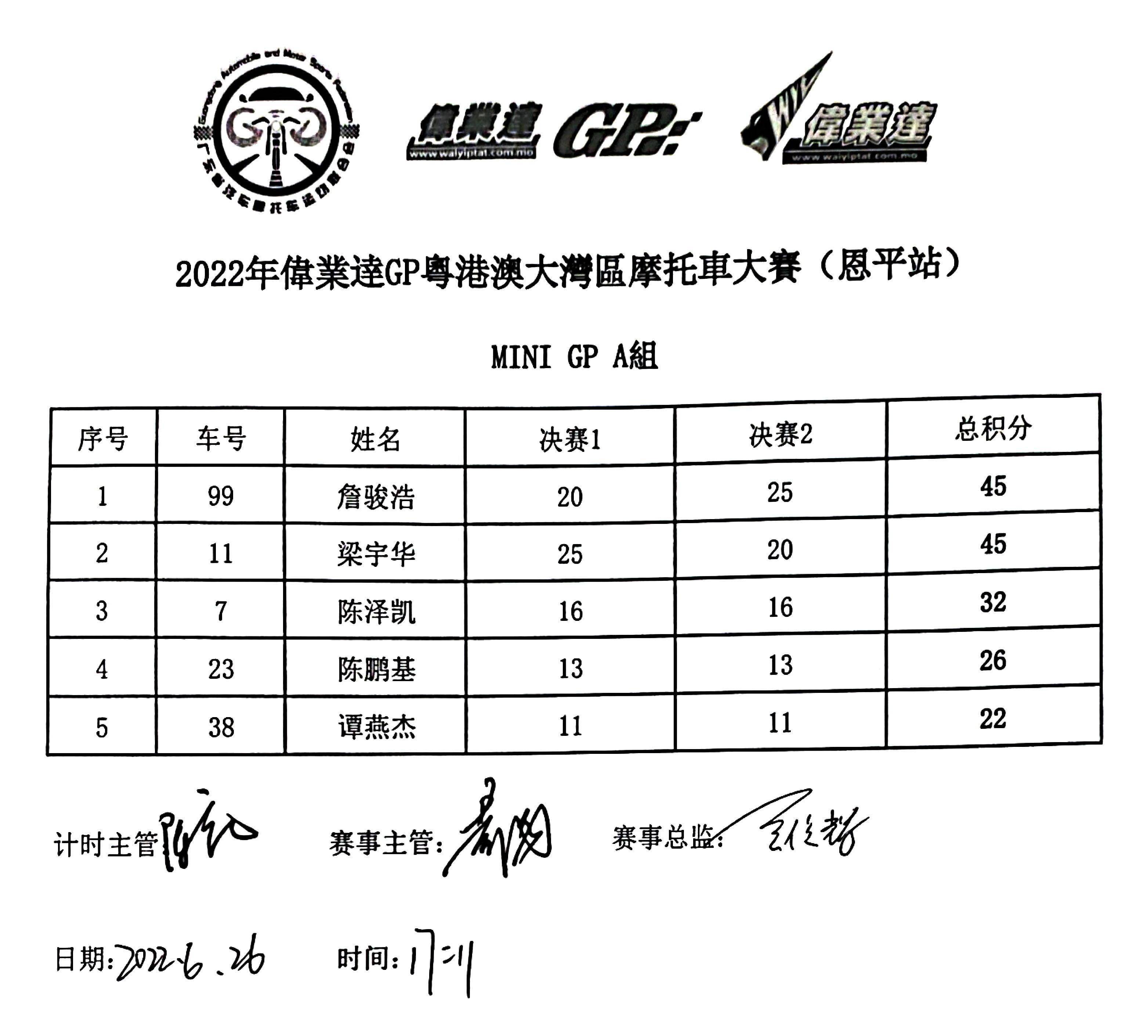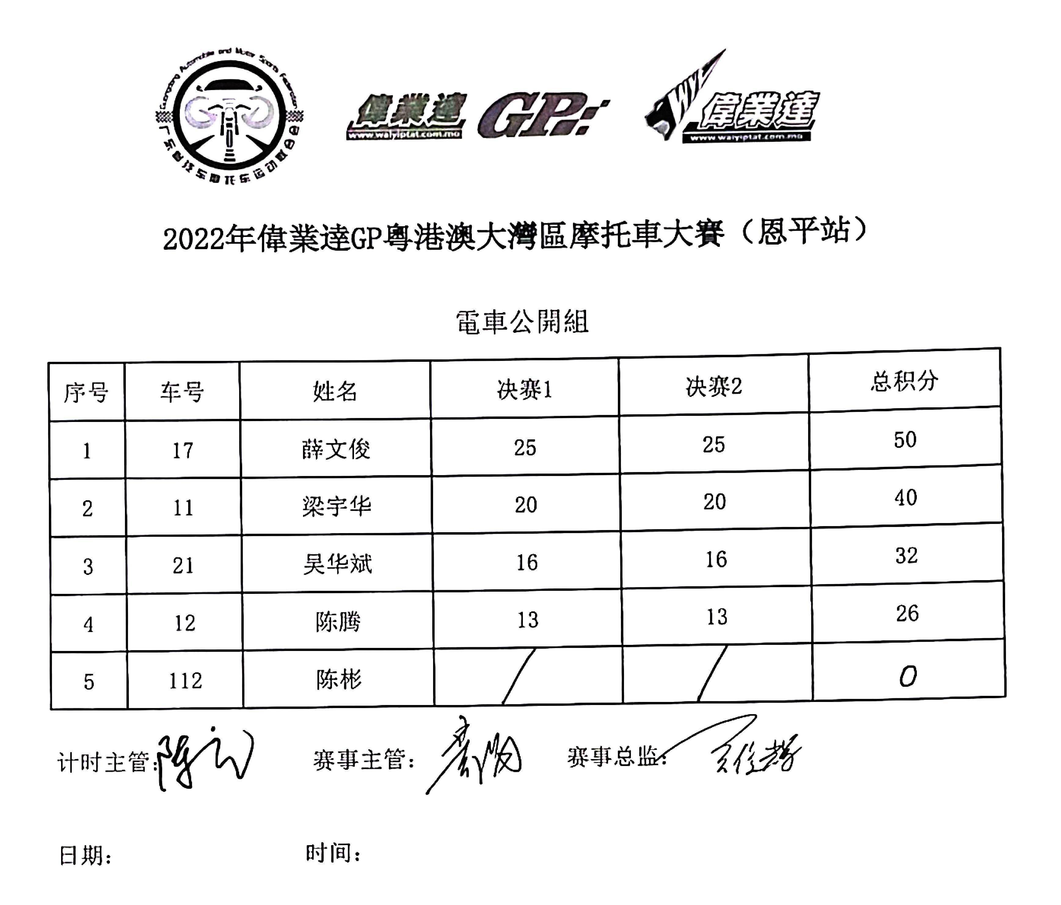 下面的圖片, 2022 偉業(yè)達(dá) GP 粵港澳大灣區(qū)摩托車大賽恩平站各組別成績(jī):