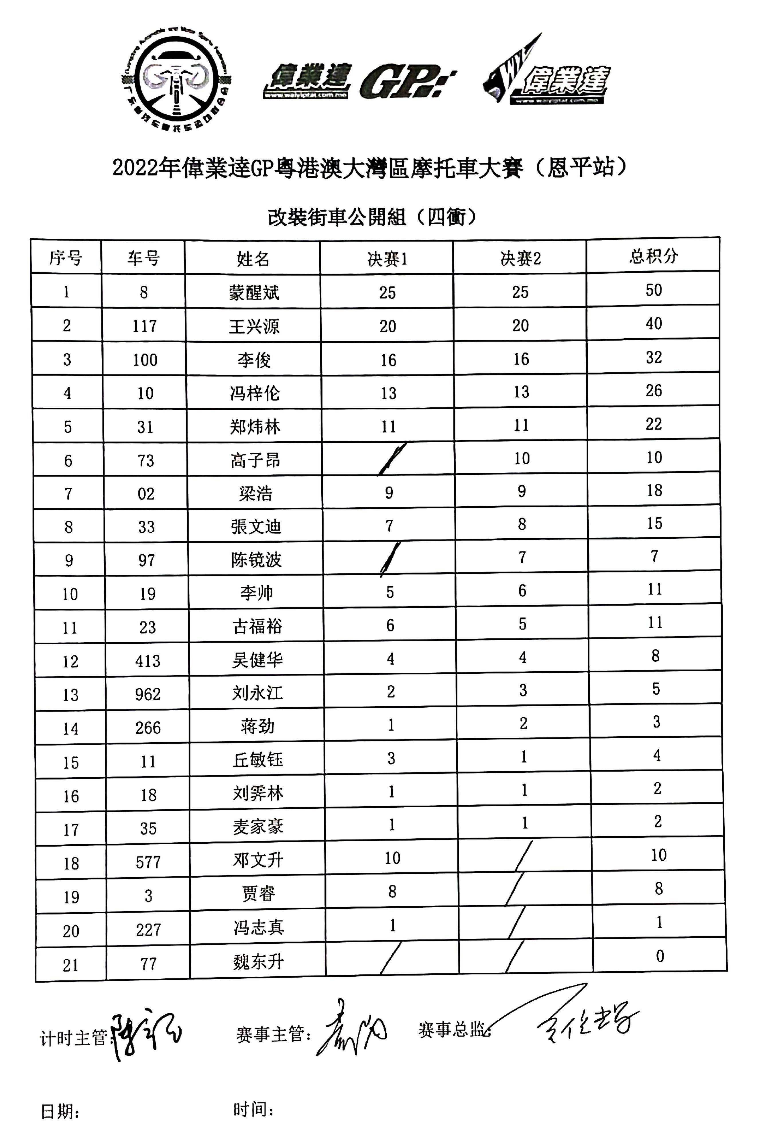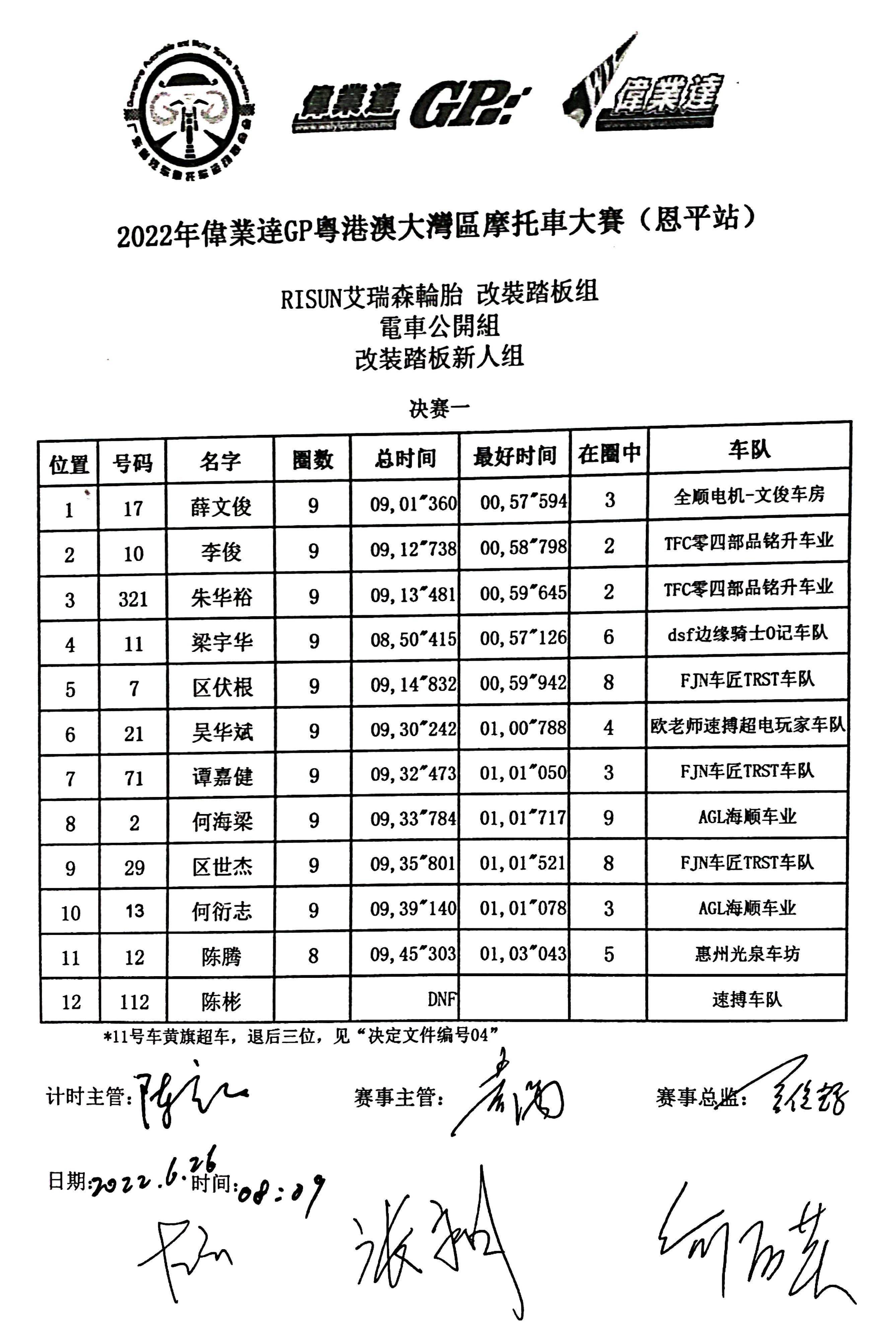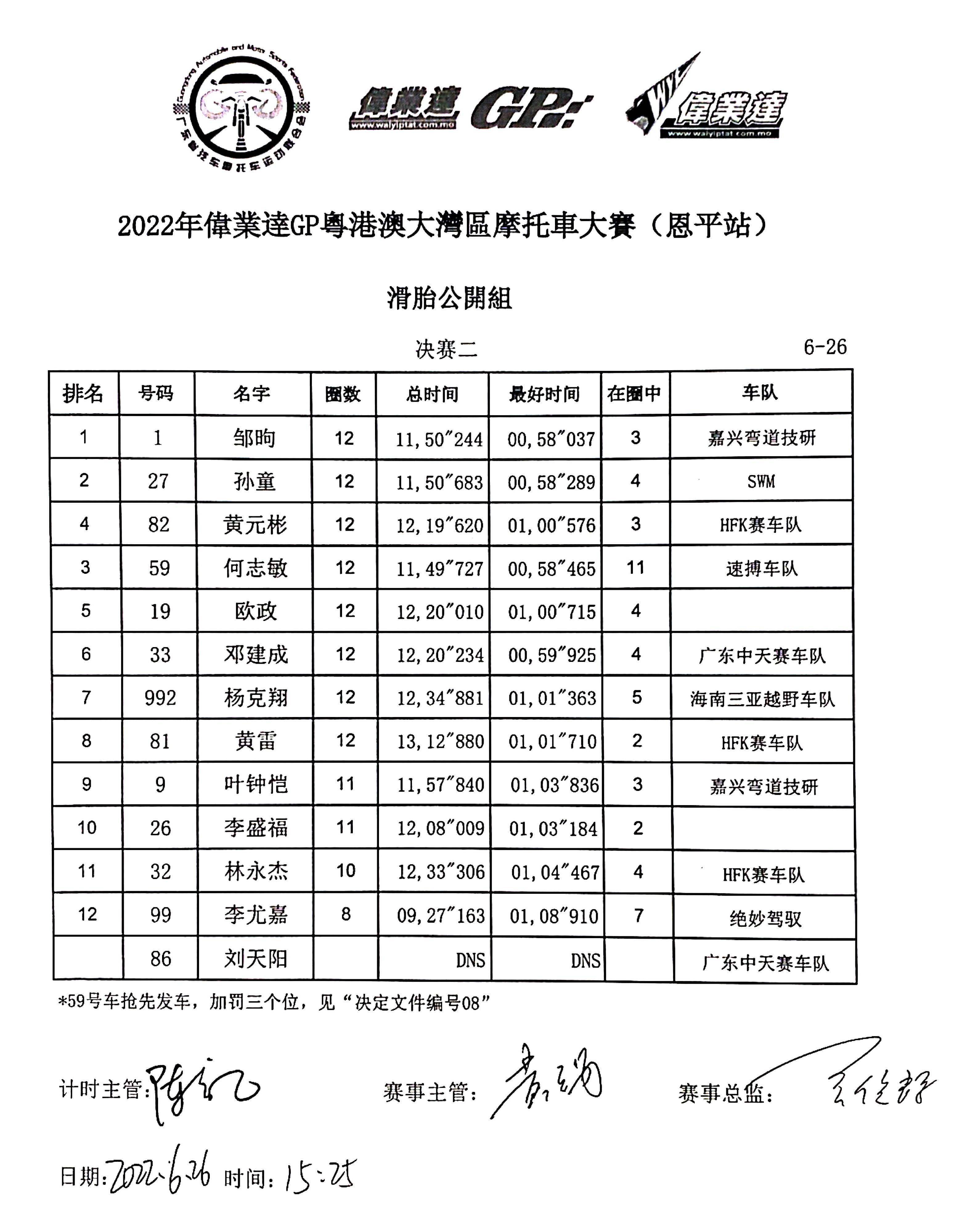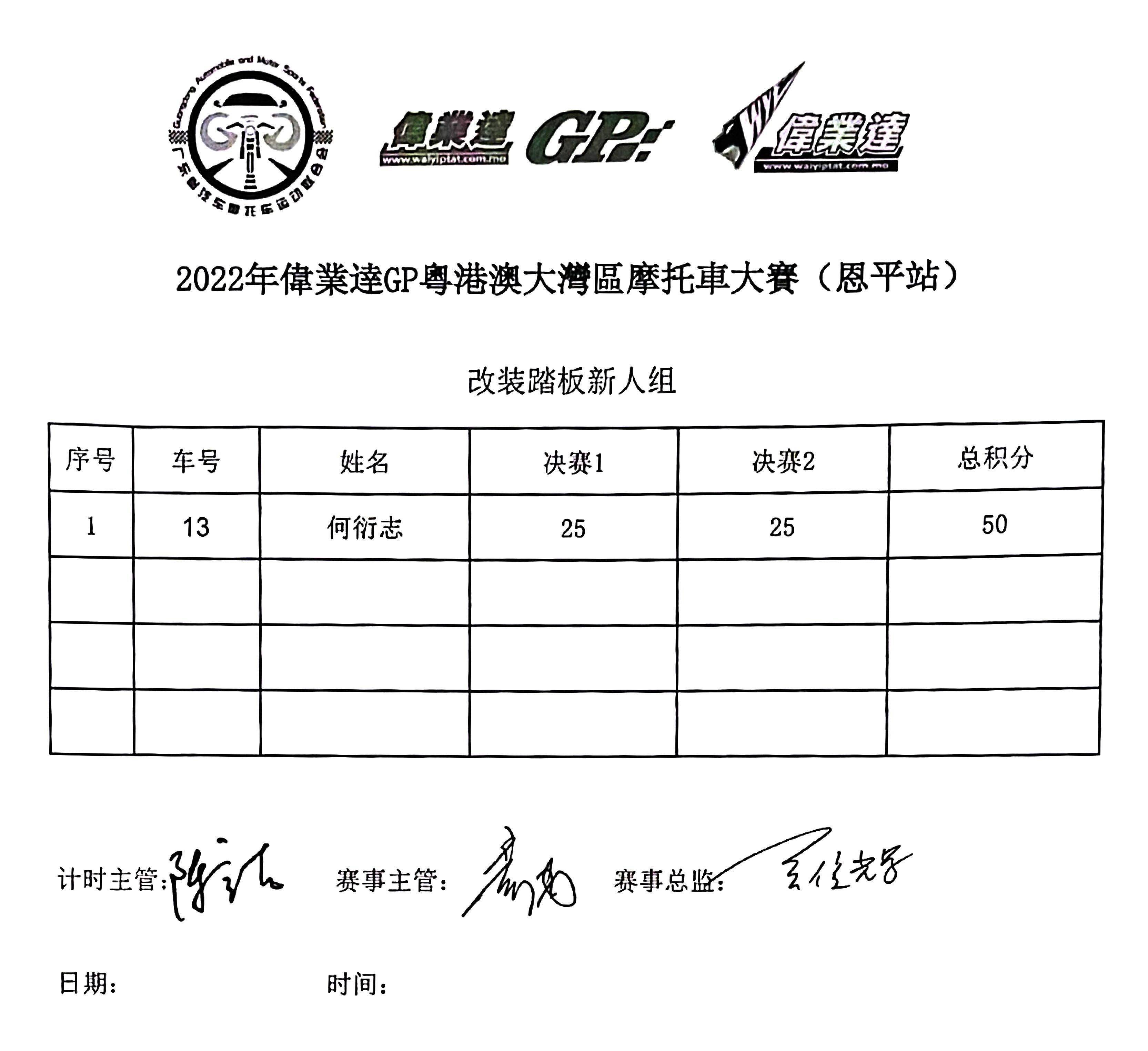 下面的圖片, 2022 偉業(yè)達(dá) GP 粵港澳大灣區(qū)摩托車大賽恩平站各組別成績(jī):