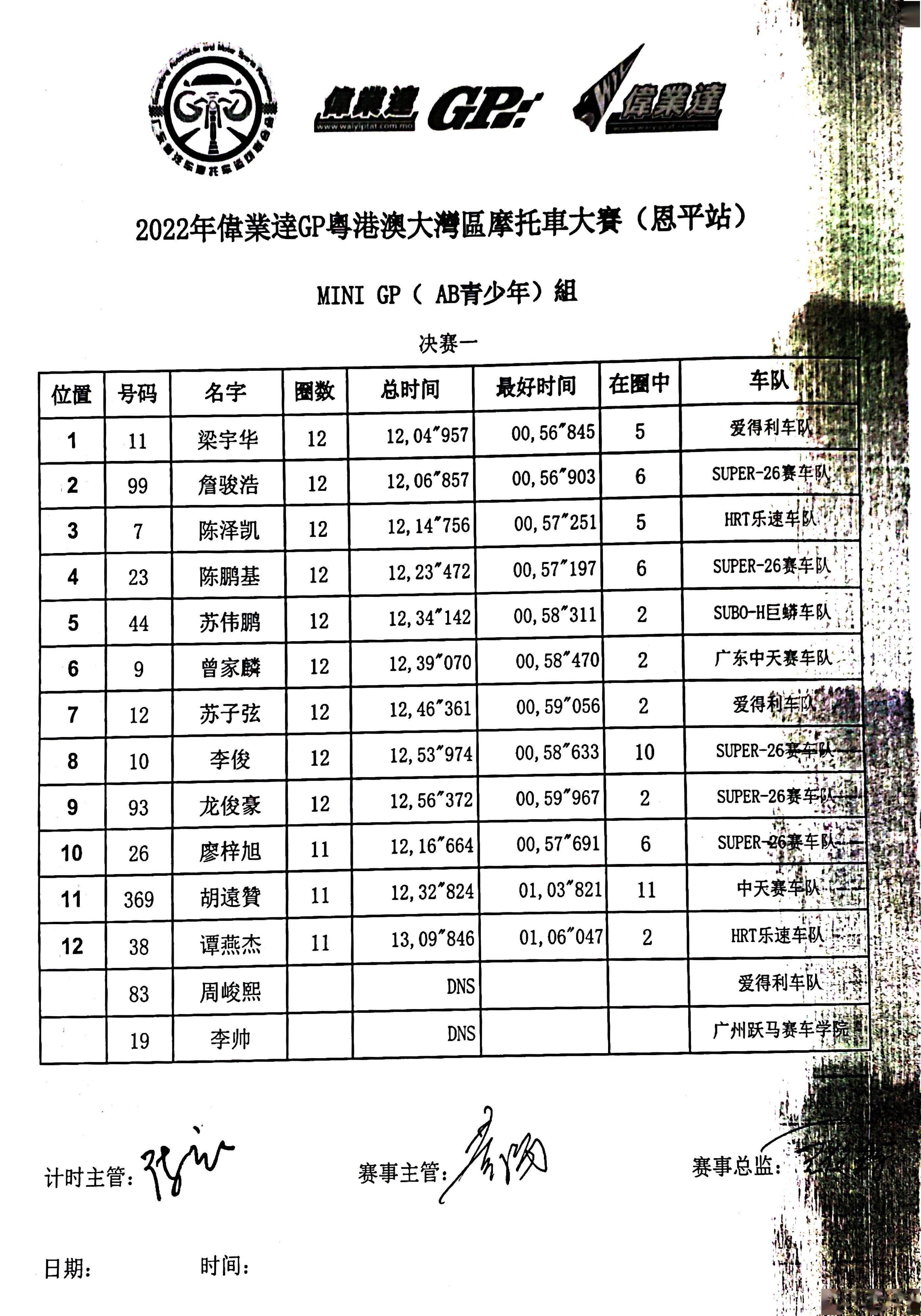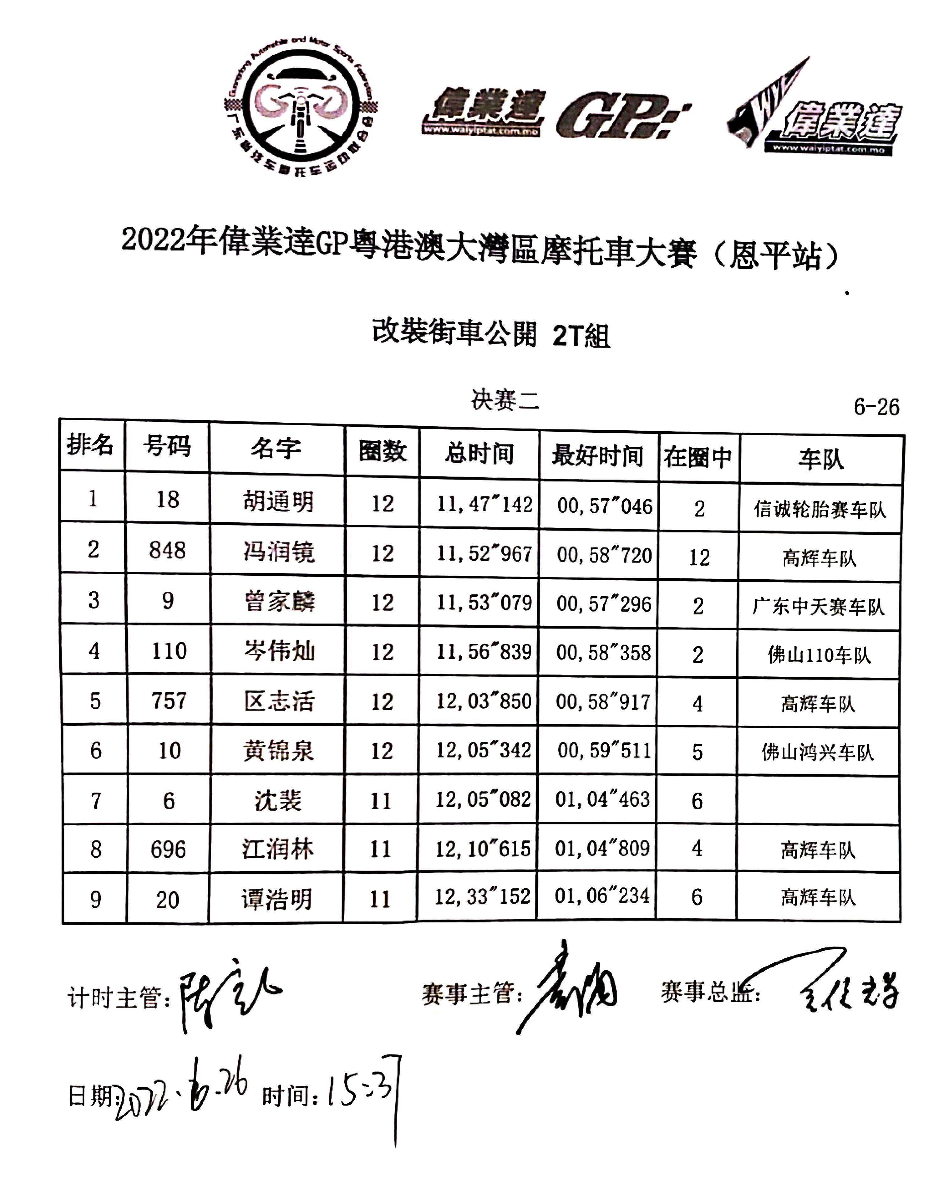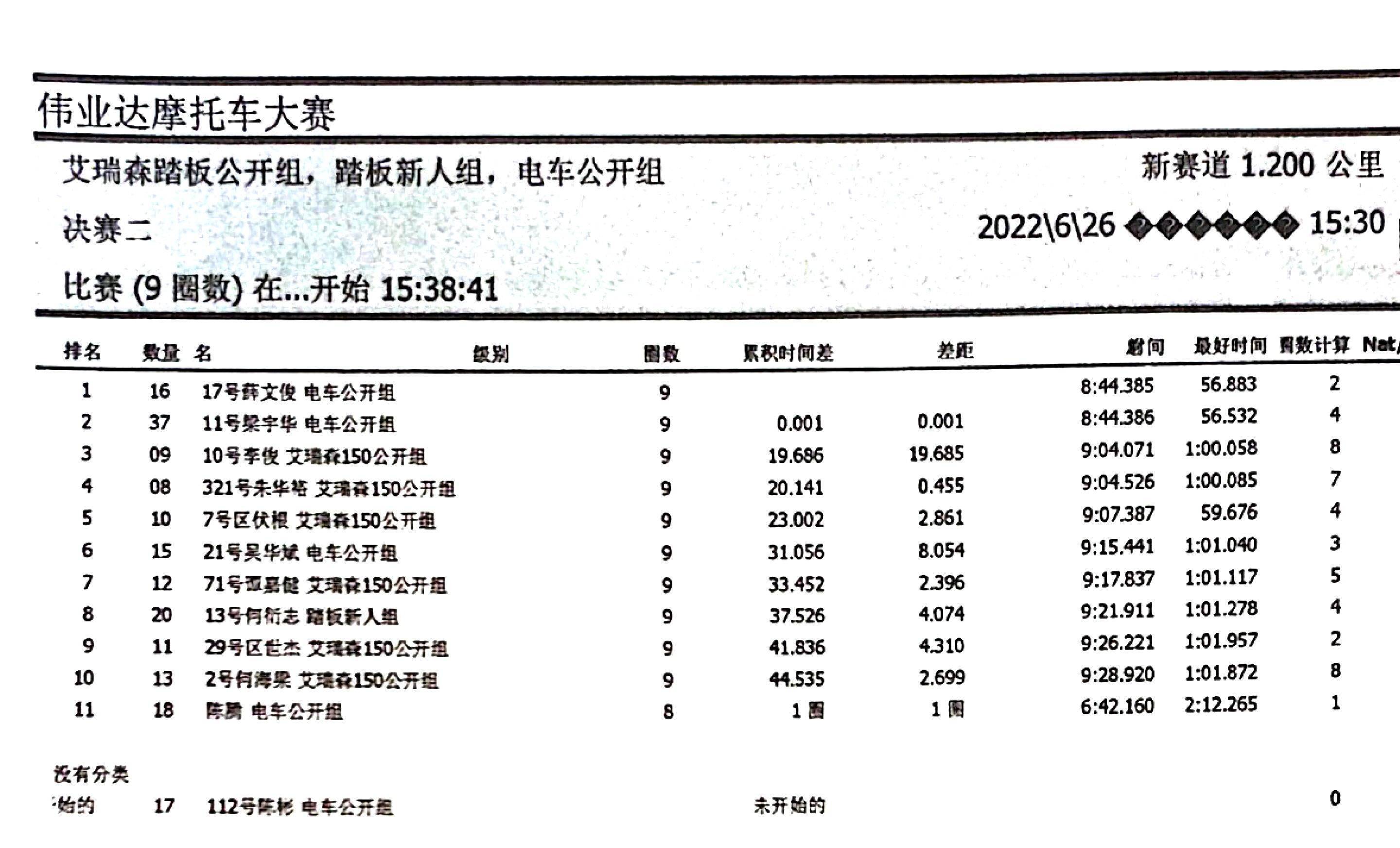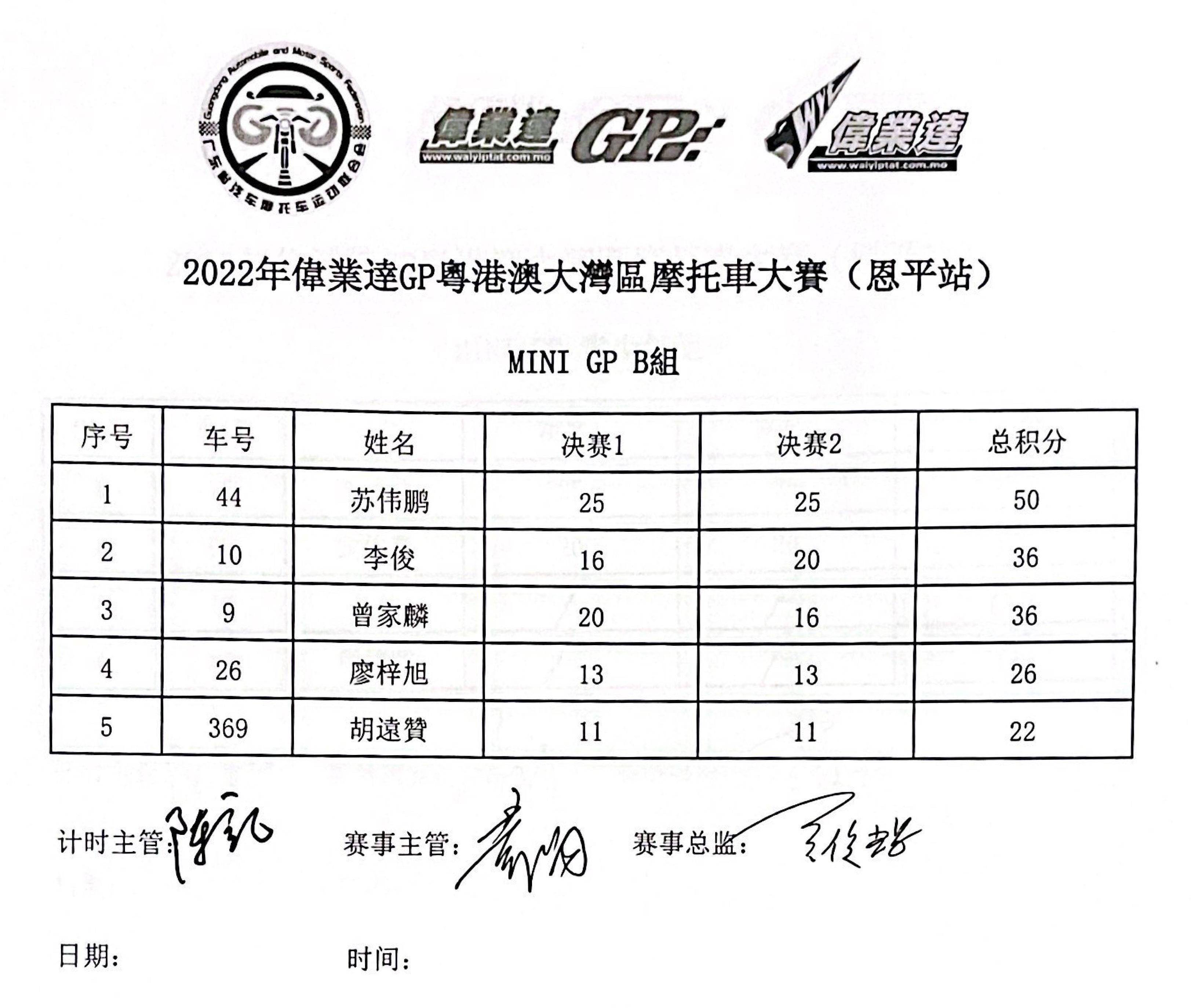 下面的圖片, 2022 偉業(yè)達(dá) GP 粵港澳大灣區(qū)摩托車大賽恩平站各組別成績(jī):
