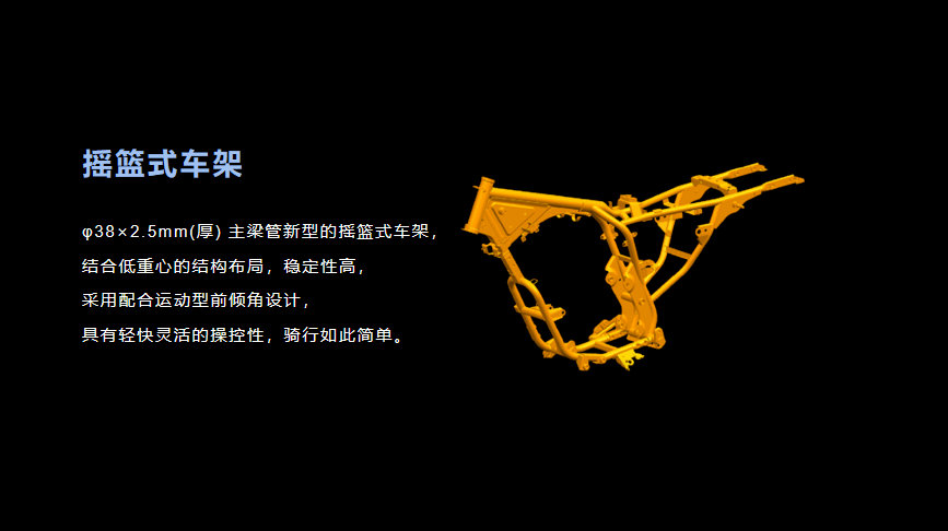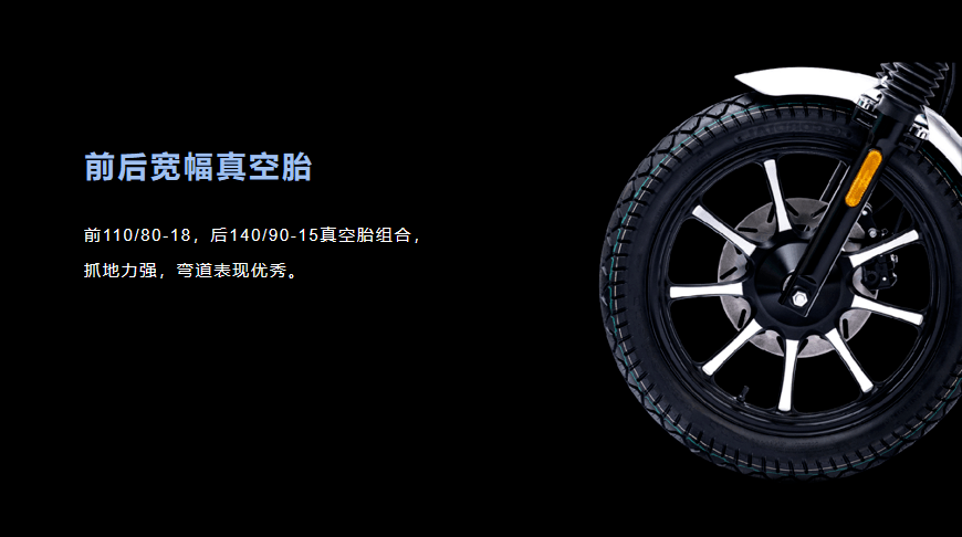搖籃式車架穩(wěn)定性更高,操控更靈活。前110/80-18,后140/90-15真空胎,抓地力更強(qiáng),彎道表現(xiàn)更優(yōu)秀。
