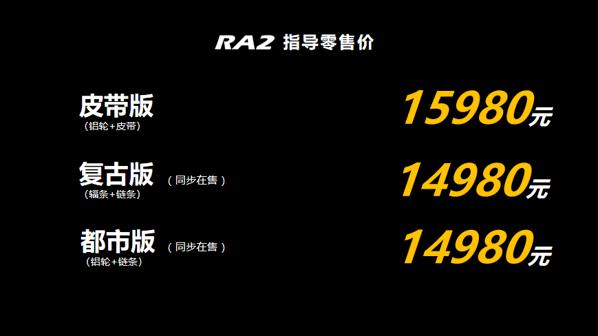 RA2價格正式公布,皮帶版15980元,復(fù)古版14980元,都市版14980元。