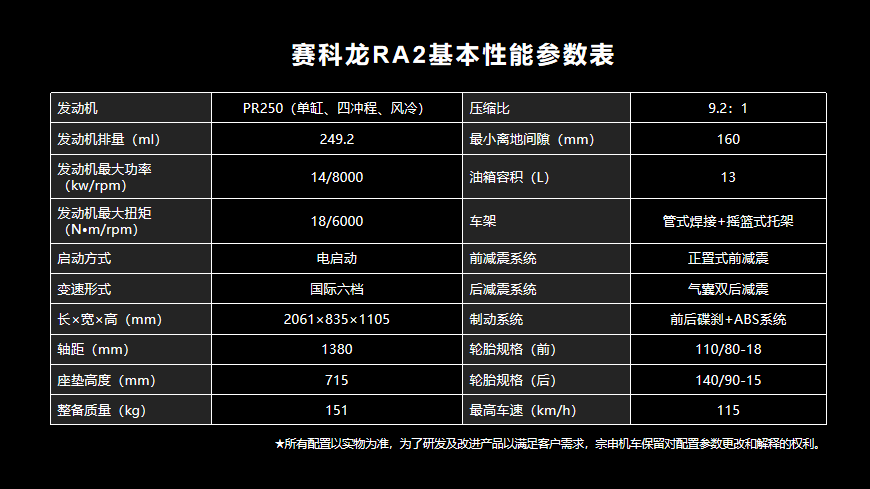 RA2采用了一臺單缸250cc風(fēng)冷發(fā)動機(jī),最大馬力約為14KW,領(lǐng)先的運動性能,堪稱動力小鋼炮。