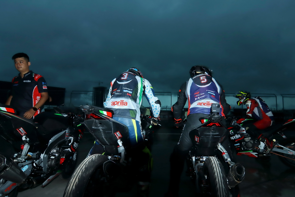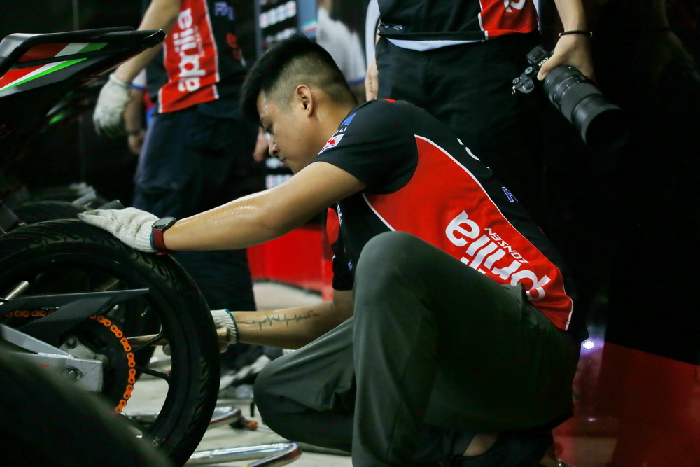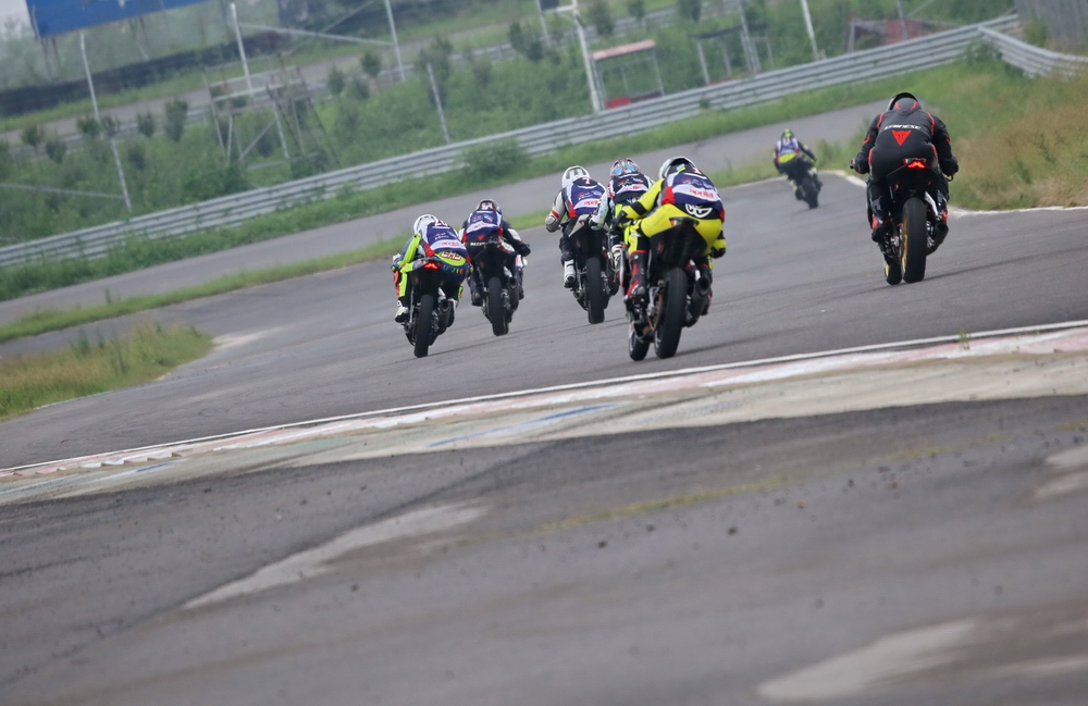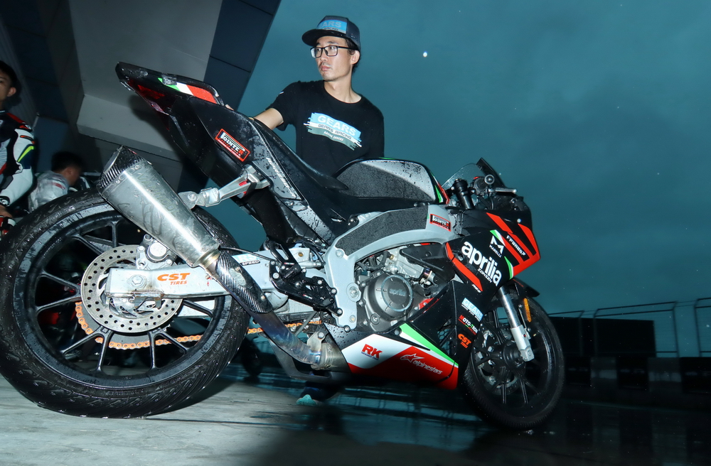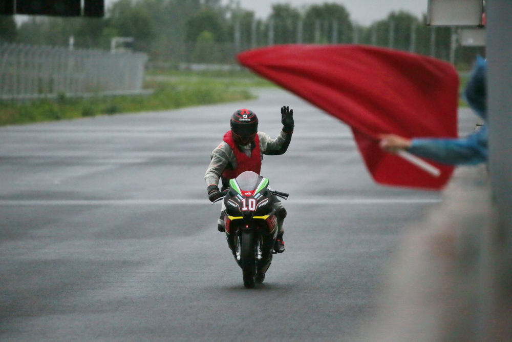 周末的時(shí)候(七月 16 日),菏澤當(dāng)?shù)叵缕鹆藘A盆大雨,早上進(jìn)行的熱身練習(xí),在濕滑的路面之下進(jìn)行。原定午后兩點(diǎn)多開始的 aprilia GPR250R 統(tǒng)一賽第一回合決賽,也因?yàn)閻毫拥奶鞖庾屌艿莱錆M積水而被推遲。