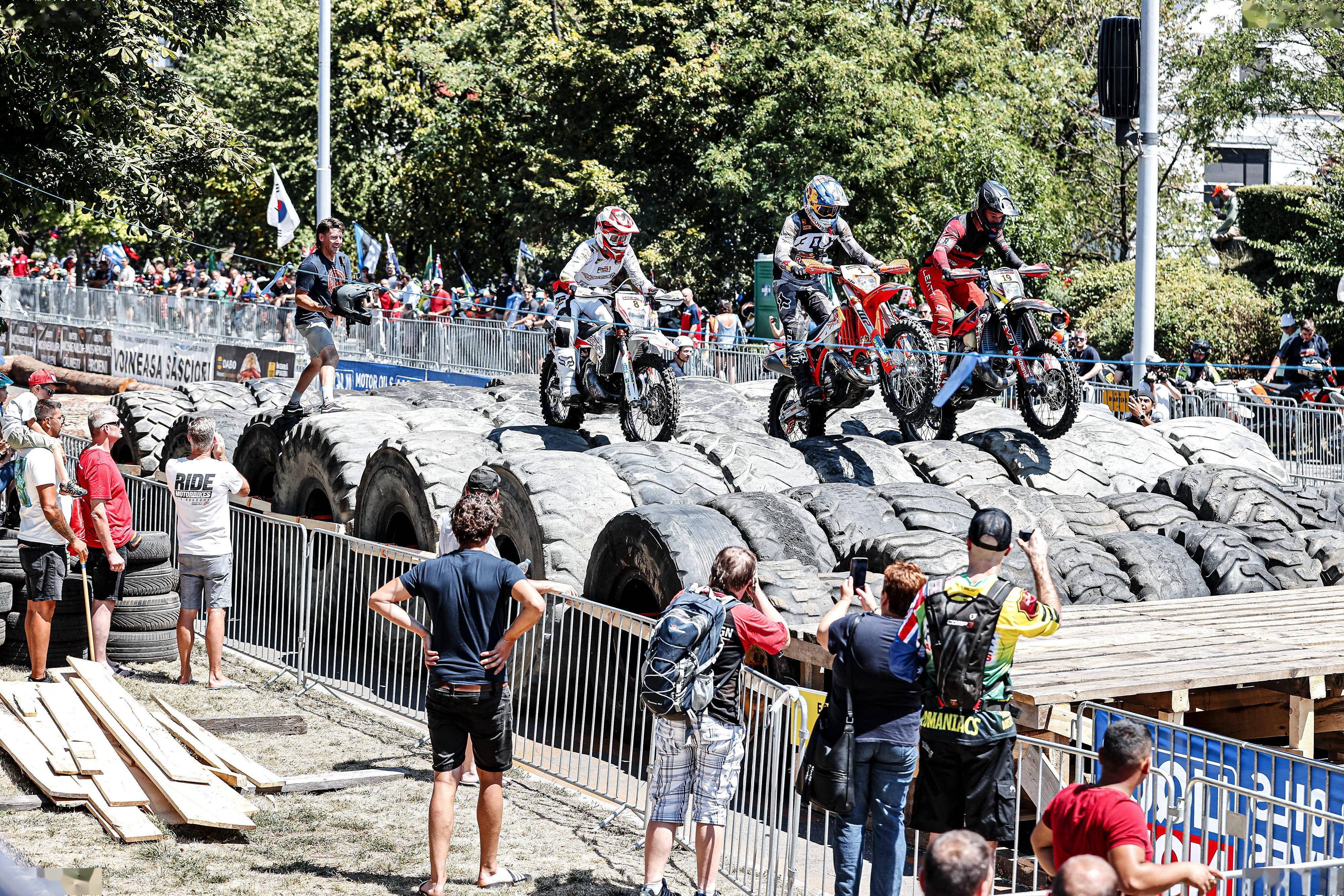 七月 25 日第一天沒有比賽,是全體車手的鎮(zhèn)內(nèi)巡游。隨后的 26 號是第一天的正式比賽,競賽環(huán)節(jié)是在錫比烏鎮(zhèn)內(nèi)街道上舉行的 “ 傳統(tǒng)項目 ”:車手們需要通過輪胎、石塊、圓木等材料組成的重重障礙,去開啟這一次的艱辛旅程。