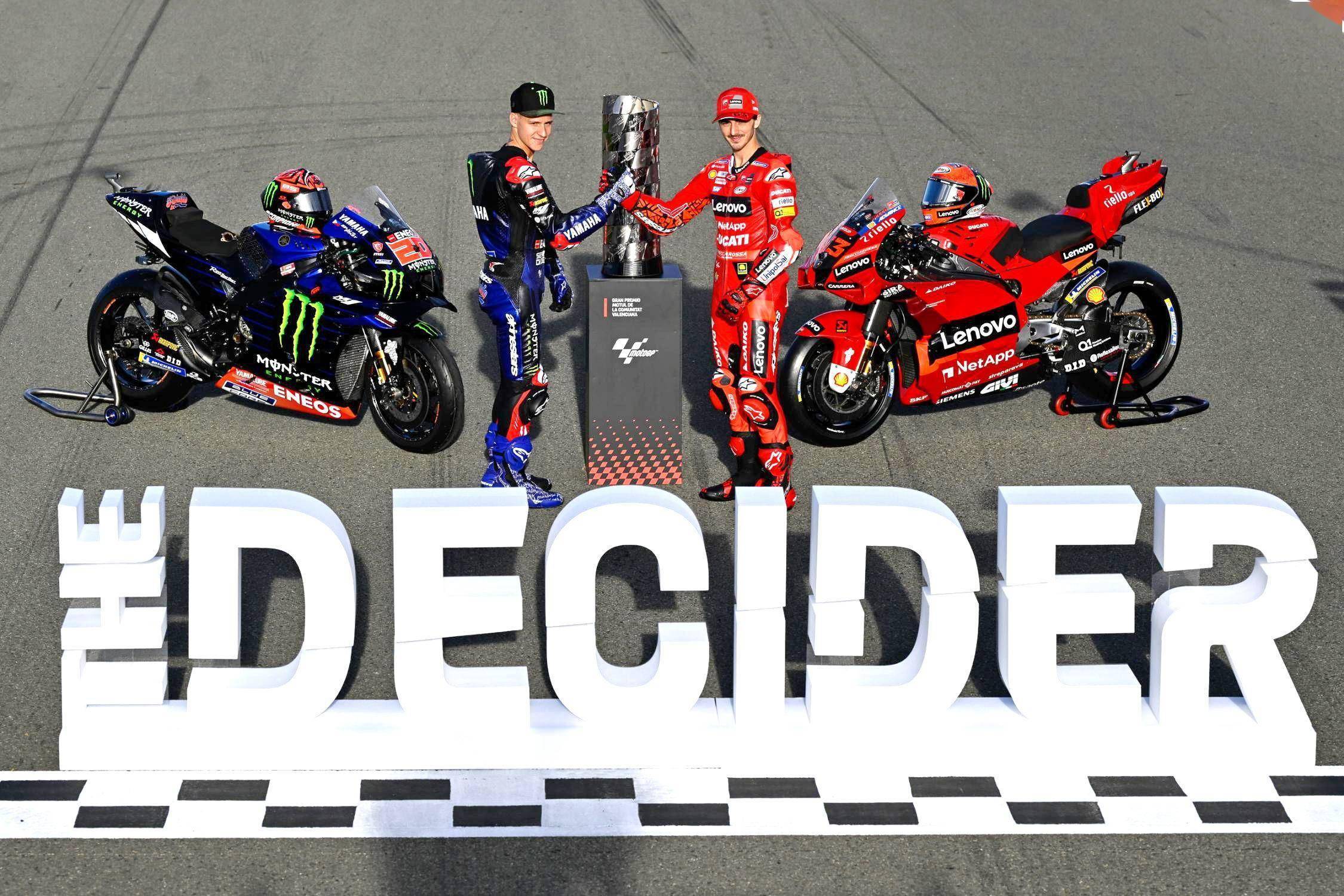 MotoGP 級(jí)別,車手的世界冠軍(車手年度積分總冠軍)之爭(zhēng)需要在本賽季的最后一個(gè)分站比賽才可以產(chǎn)生:上一站、馬來西亞雪邦站的比賽之后,杜卡迪工廠車隊(duì)的車手巴納亞(Francesco Bagnaia)以 258 分排在積分榜的首位,排在第二的是應(yīng)屆世界冠軍、Yamaha 工廠車隊(duì)的夸塔拉羅(Fabio Quartararo),他落后巴納亞 23 分。