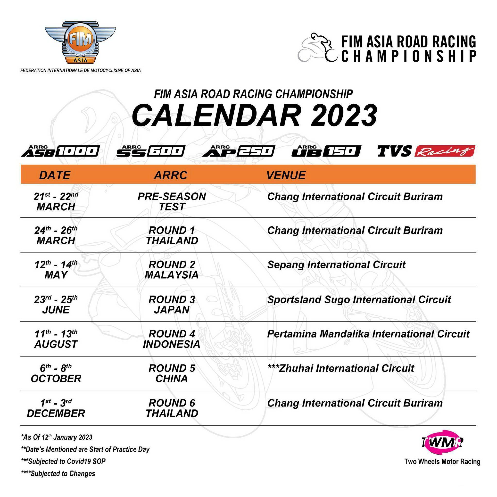 一月 12 日,F(xiàn)IM ARRC(FIM Asia Road Racing Championship)亞洲公路錦標(biāo)賽的推廣公司、馬來(lái)西亞的 TWMR 發(fā)布了 2023 賽季的暫定賽程表。