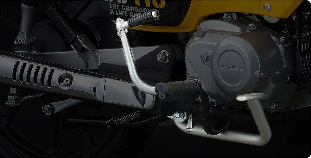 動力為單缸風(fēng)冷110CC發(fā)動機,輸出功率高、運行安靜,油耗低至1.5升百公里半自動離合器、四擋變速。其他配置有單通道ABS系統(tǒng),雙槍液壓后減震,腳踩啟動桿設(shè)計,提供啟動時的備用保障,雙人騎乘的可拆卸坐墊,可載人或載物。