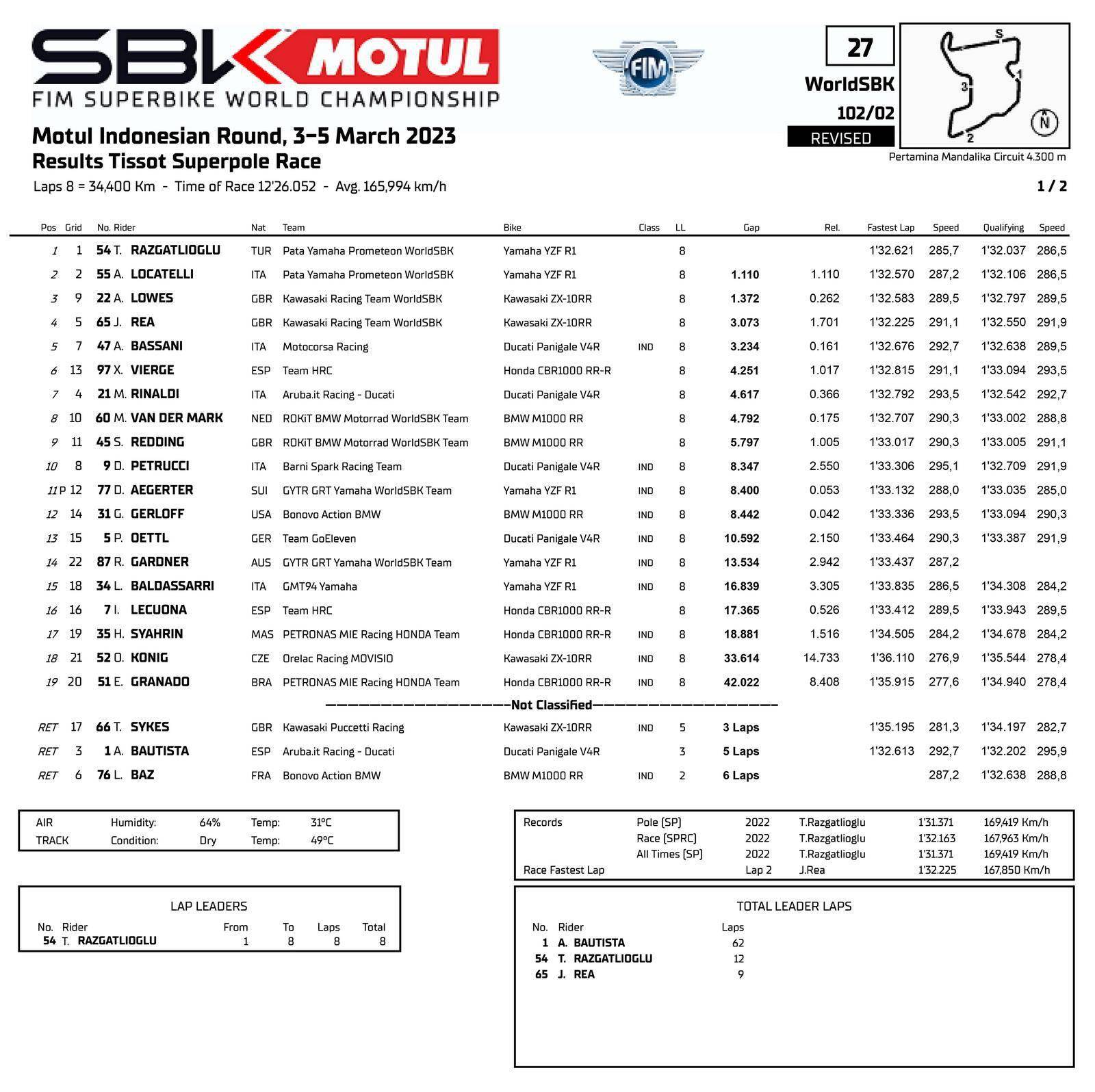 WSB 級別,賽前的 Super Pole 超級排位賽,54 號車、拉格里奧盧(Toprak Razgatlioglu)跑出了 1 分 32.037 秒的最佳圈速,奪得了第一節(jié)比賽的排頭位出賽;他的隊友、55 號車的洛卡泰利(Andrea Locatelli),1 號車的應(yīng)屆世界冠軍捌弟(Alvaro Bautista,巴迪斯塔),分別排在第二、第三位發(fā)車。