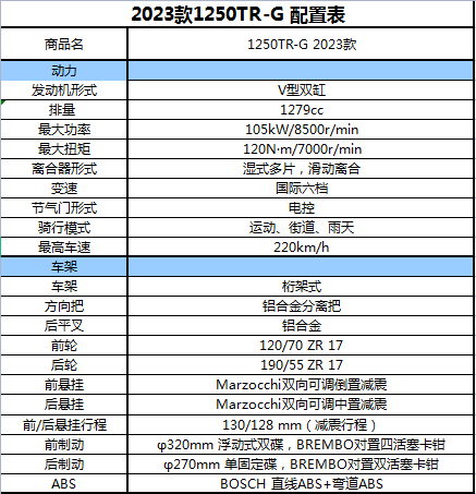 全新2023款1250TR-G,搭載CFMOTO最新75°V型雙缸引擎,既擁有出色的低扭表現(xiàn),同時(shí)也能兼顧高轉(zhuǎn)的動(dòng)力輸出。搭載Brembo剎車卡鉗、MARZOCCHI減震、MAGURA液壓離合、MUELLER轉(zhuǎn)向阻尼等聯(lián)合世界T1級別的大牌零部件供應(yīng)商,打造全明星豪華陣容,機(jī)械素質(zhì)遙遙領(lǐng)先。電子配置方面,除了原有的領(lǐng)先配置,2023款1250TR-G新增了雙向快速換擋,配備RDS雷達(dá)探測系統(tǒng),可實(shí)現(xiàn)了盲區(qū)監(jiān)測、變道輔助、后碰撞預(yù)警三大功能,犀靈最完整、最先進(jìn)的智能體驗(yàn)。國產(chǎn)品牌最大的12.3英寸LTPS車規(guī)級高清大屏,實(shí)現(xiàn)定制導(dǎo)航、前后通話、無線CARPLAY等功能,操作便捷。首次搭載HIFI級JBL音響,四聲道帶獨(dú)立功放,環(huán)繞立體音效,搭配前后加熱坐墊,打造沉浸式豪華座艙體驗(yàn),愜意旅行。