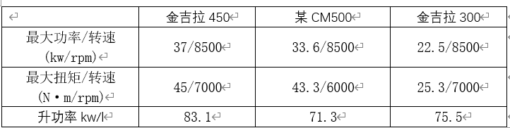 450最大功率則達到37千瓦/8500,最高扭矩達到45牛米/7000,比本田CM500更高,升功率上也表現(xiàn)的非常明顯,本田CM500的升功率為71.3kw/L,而金吉拉450是83.1kw/L,提升16.5%??梢娊鸺?50低扭定然十分出色。同時,金吉拉450比金吉拉300更是高出了64%的功率,但售價比TCS版金吉拉300僅高出3100元,比豪爵TR300還便宜1000元,這是卷起來,連自己都不放過啊!