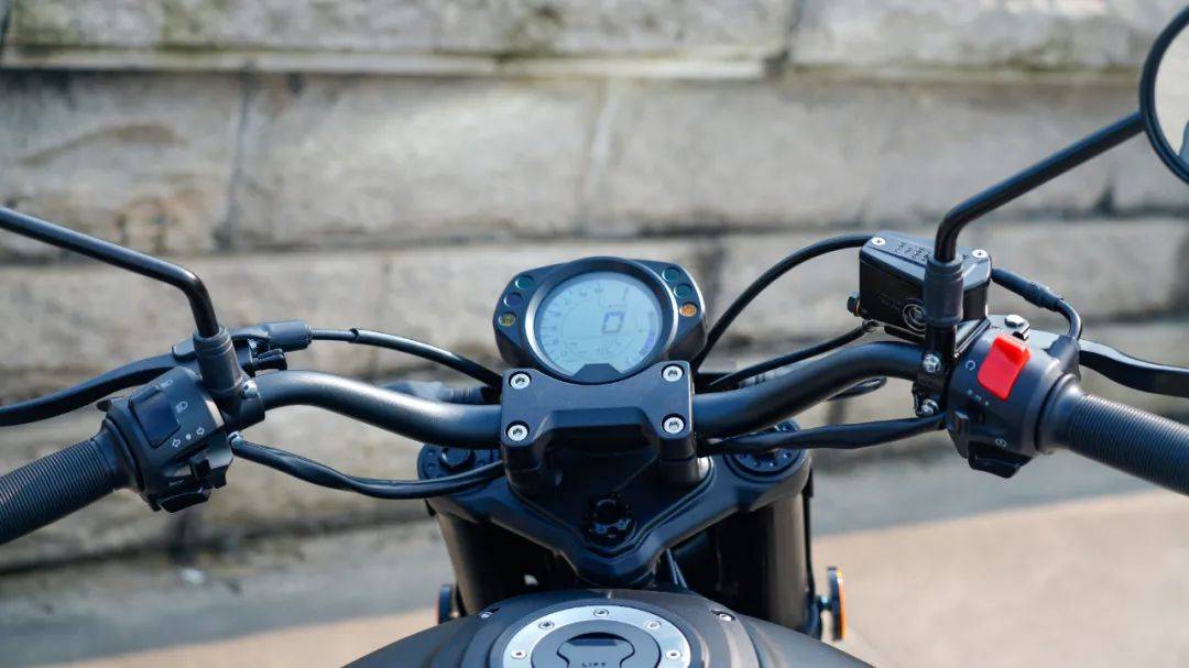 搭配一塊常規(guī)LCD負(fù)顯儀表,實(shí)測大太陽下顯示效果良好。常規(guī)的手把按鍵,鋁合金變徑一體式手把,整體手把比常規(guī)街車更高一些也更靠向駕駛者。