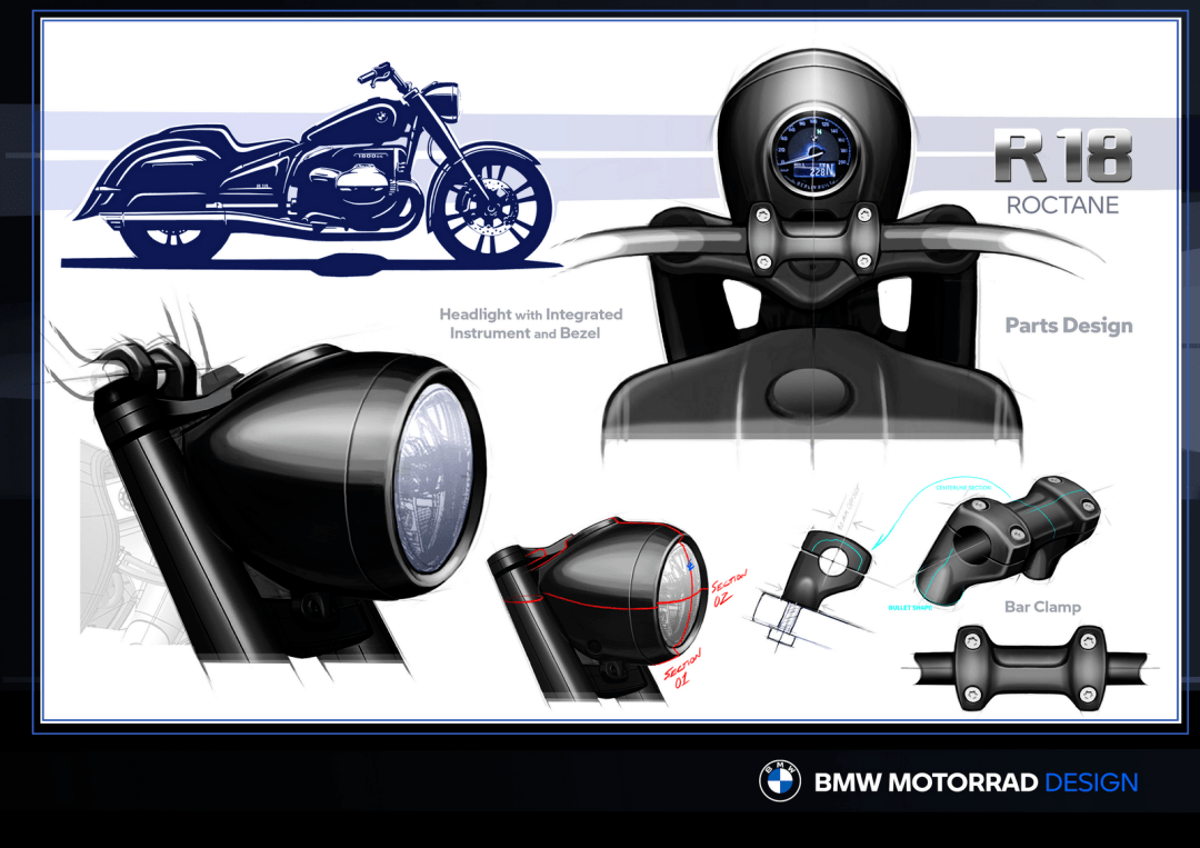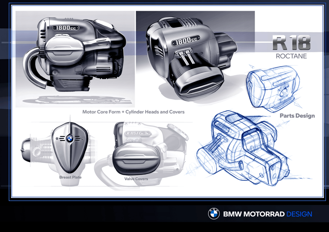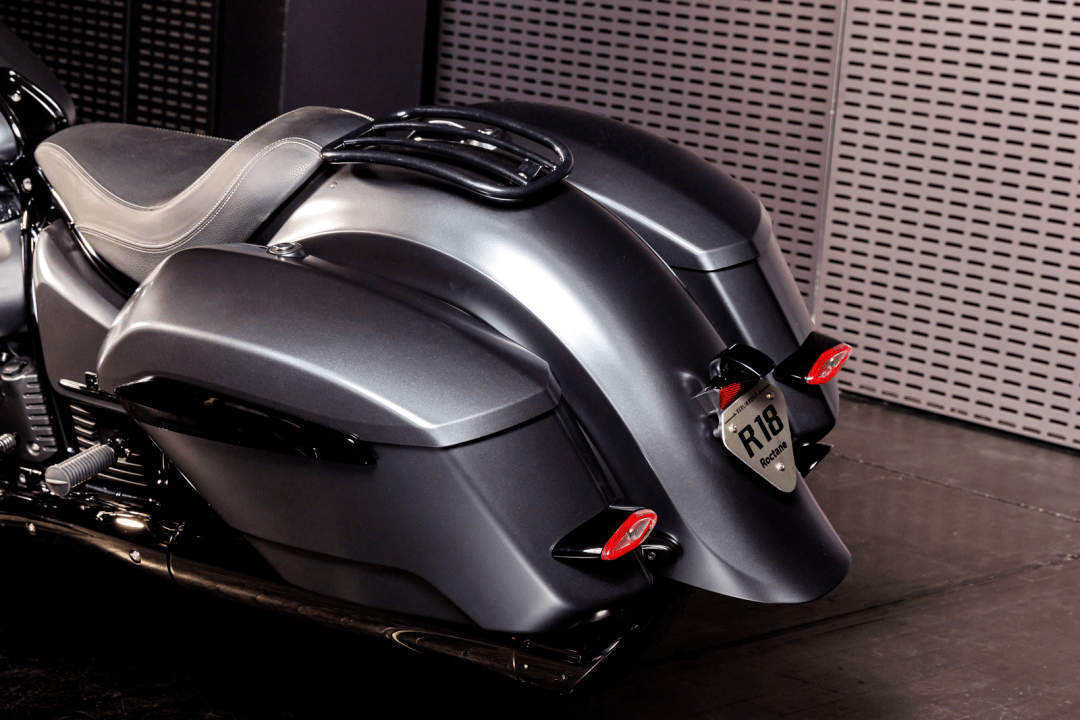 外部風(fēng)格上,新的 R 18 Roctane 有著巡航 + 旅行車綜合體的 Bagger 風(fēng)格,圓滑的尾部線條與 R 18 B 相似,整體造型幾乎就是拆除了車頭大型整流罩之后的 R 18 B。