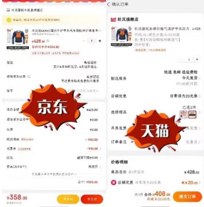 比如杜漢摩托車護(hù)甲衣就是一款不錯(cuò)的夏季摩托車通勤騎行服,其在盡可能修身塑形的前提下采用了3D透氣網(wǎng)面材料,七塊CE材料慢回彈護(hù)甲給到全方位抗沖擊保護(hù)。為摩友帶來了既安全又炫酷的騎行體驗(yàn)。618期間杜漢摩托車護(hù)甲衣天貓到手價(jià)408元;京東到手價(jià)358元,依舊是京東價(jià)格更有優(yōu)勢,并且差價(jià)高達(dá)50元,看來今年京東618真是要把省錢進(jìn)行到底了。