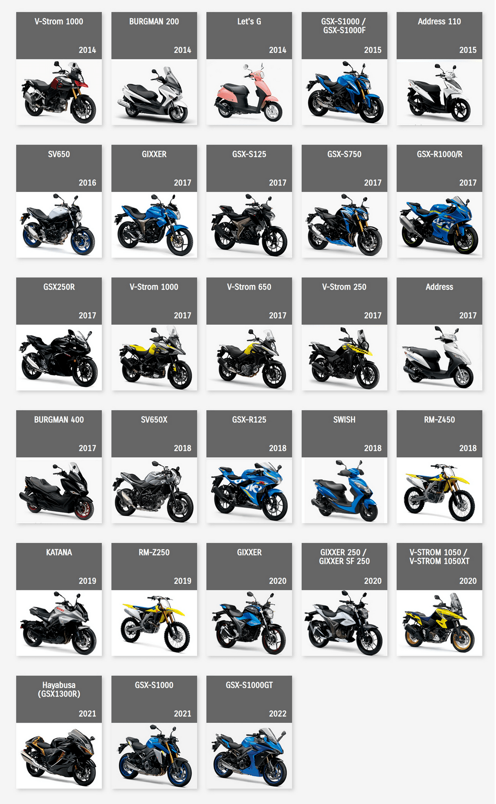 下面的圖片來自 Suzuki Global,是這家日本制造商自 1952 年到 2022 年,在摩托車領(lǐng)域里大部分量產(chǎn)車的型號清單。 (以發(fā)布年份的先后 粗略排列)