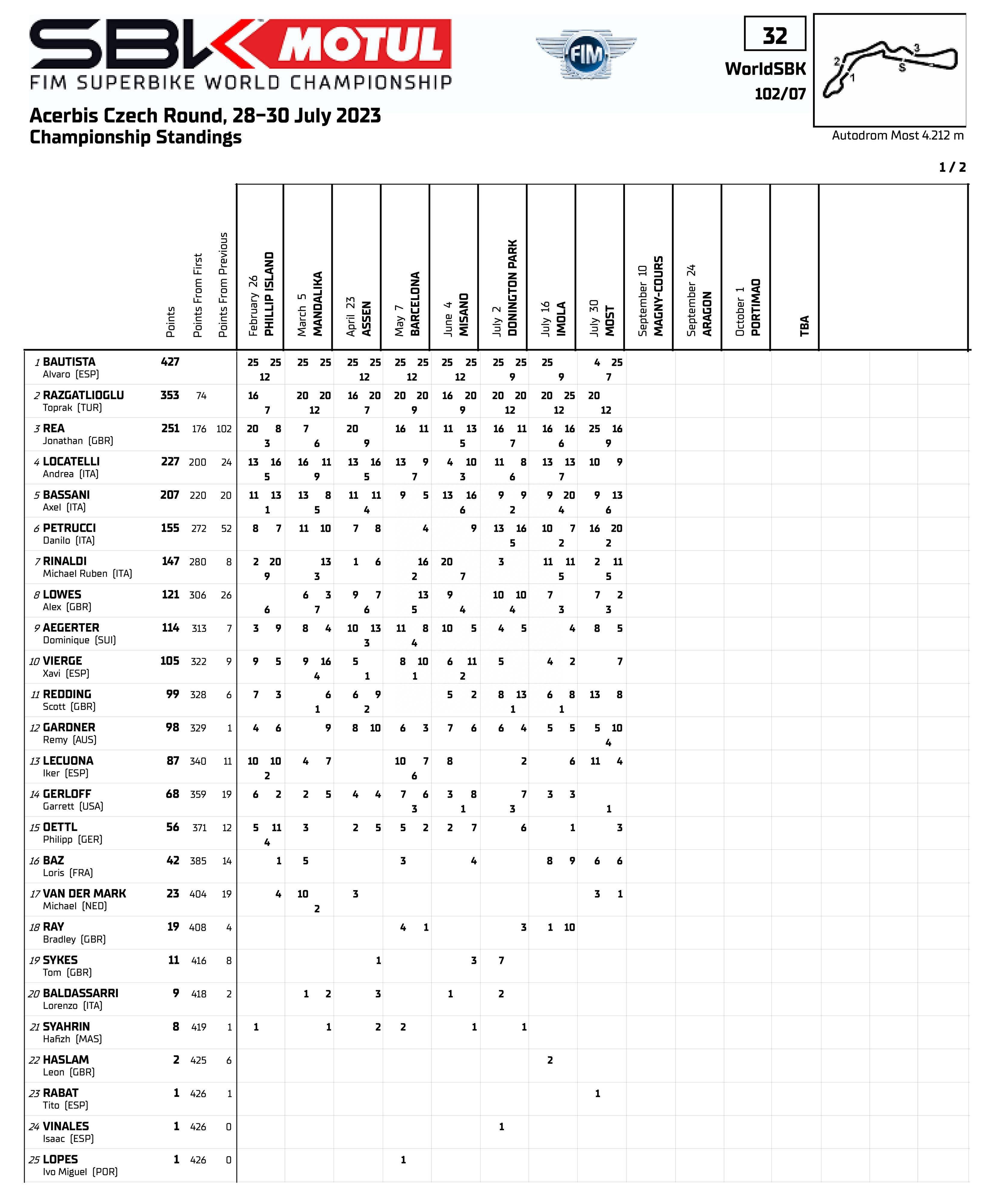 本站的比賽結(jié)束后,捌弟在車手積分榜上以 427 分暫居榜首、優(yōu)勢明顯,拉格里奧盧以 353 分排在第二,雷亞以 251 分暫時排在第三。