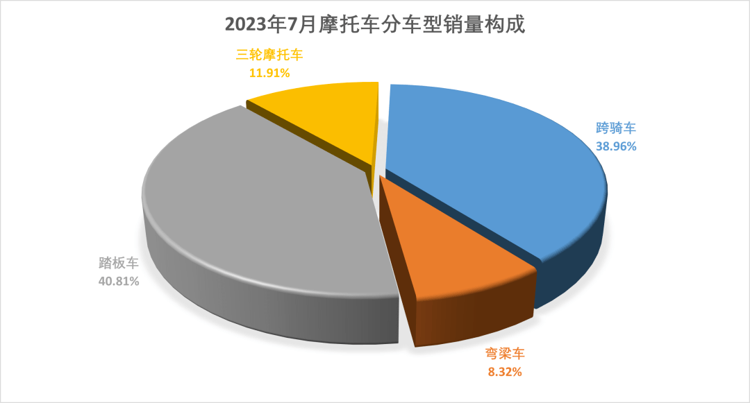 1-7月,跨騎車產(chǎn)銷436.09萬輛和439.72萬輛,同比下降4.44%和5.26%;踏板車產(chǎn)銷500.37萬輛和460.58萬輛,產(chǎn)銷量同比下降14.97%和22.43%;彎梁車產(chǎn)銷93.5萬輛和93.86萬輛,同比增長2.7%和3.38%。從各車型銷量占二輪車總銷量的比重看,跨騎、踏板和彎梁三類車型占比分別為44.23%、46.33%和9.44%。