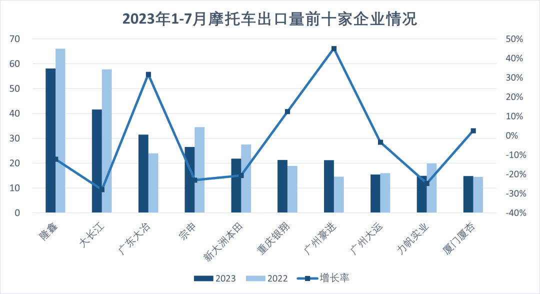 1-7月,摩托車出口量排名前十位的企業(yè)依次為:隆鑫、大長江、大冶、宗申、新大洲本田、銀翔、豪進(jìn)、大運(yùn)、力帆、廈杏,上述十家企業(yè)共出口267.51萬輛,占摩托車出口總量的63.64%。