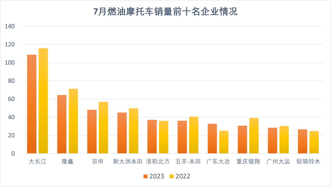 1-7月,燃油摩托車銷量前十名企業(yè)(集團(tuán))為大長江、隆鑫、宗申、新大洲本田、洛陽北方、五羊-本田、廣東大冶、重慶銀翔、廣州大運(yùn)、輕騎鈴木,分別銷售108.82萬輛、64.3萬輛、48.15萬輛、45.1萬輛、37.04萬輛、36.1萬輛、32.8萬輛、30.67萬輛、28.47萬輛和26.61萬輛。