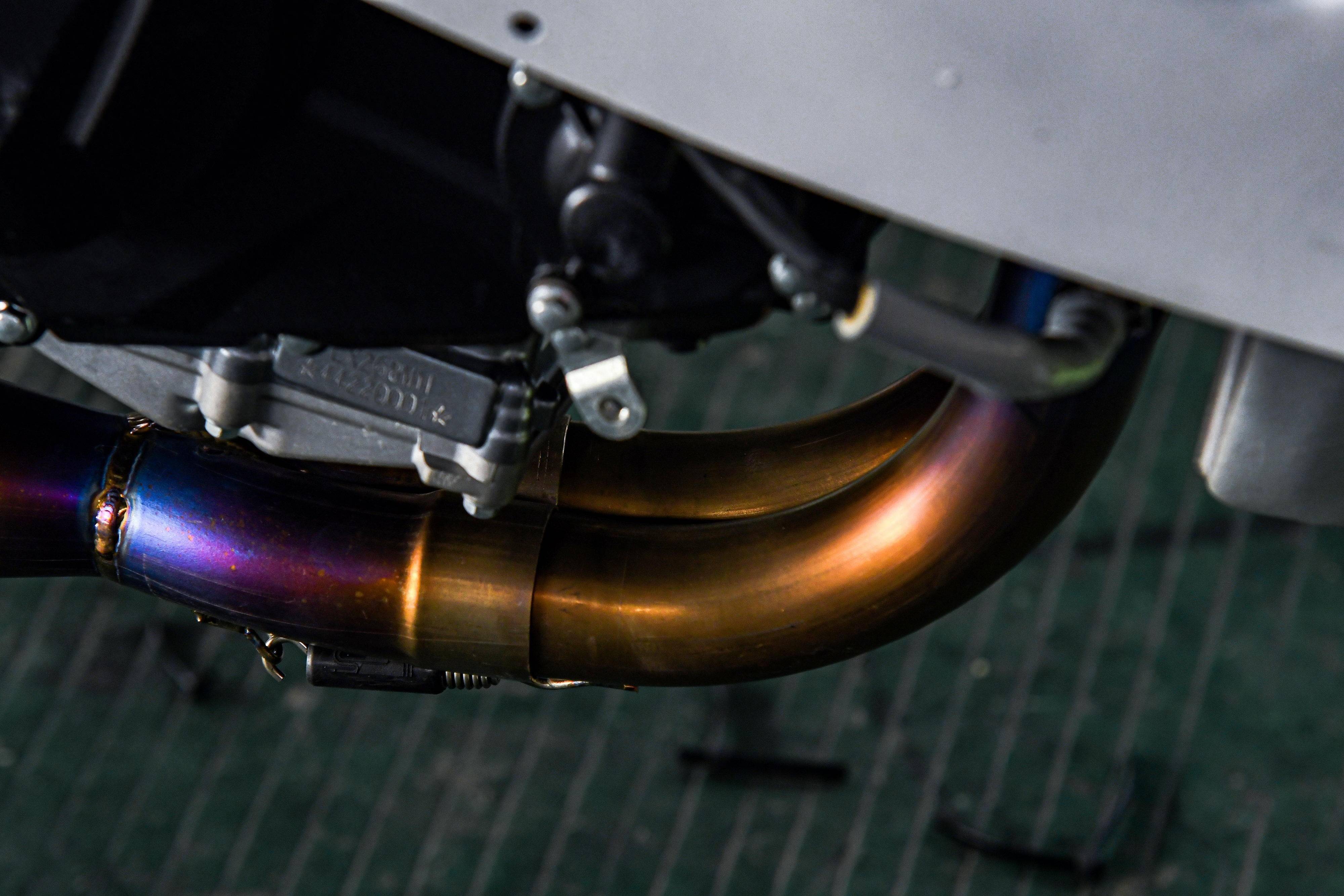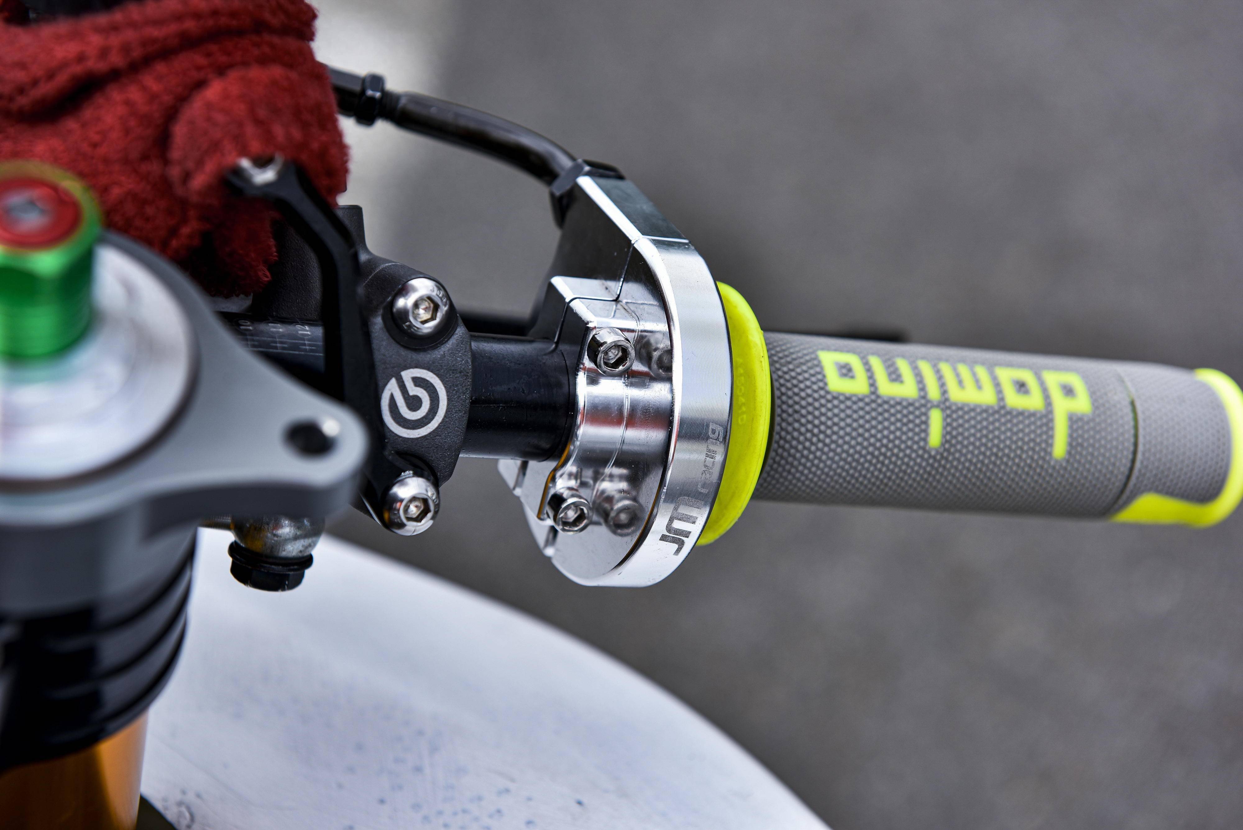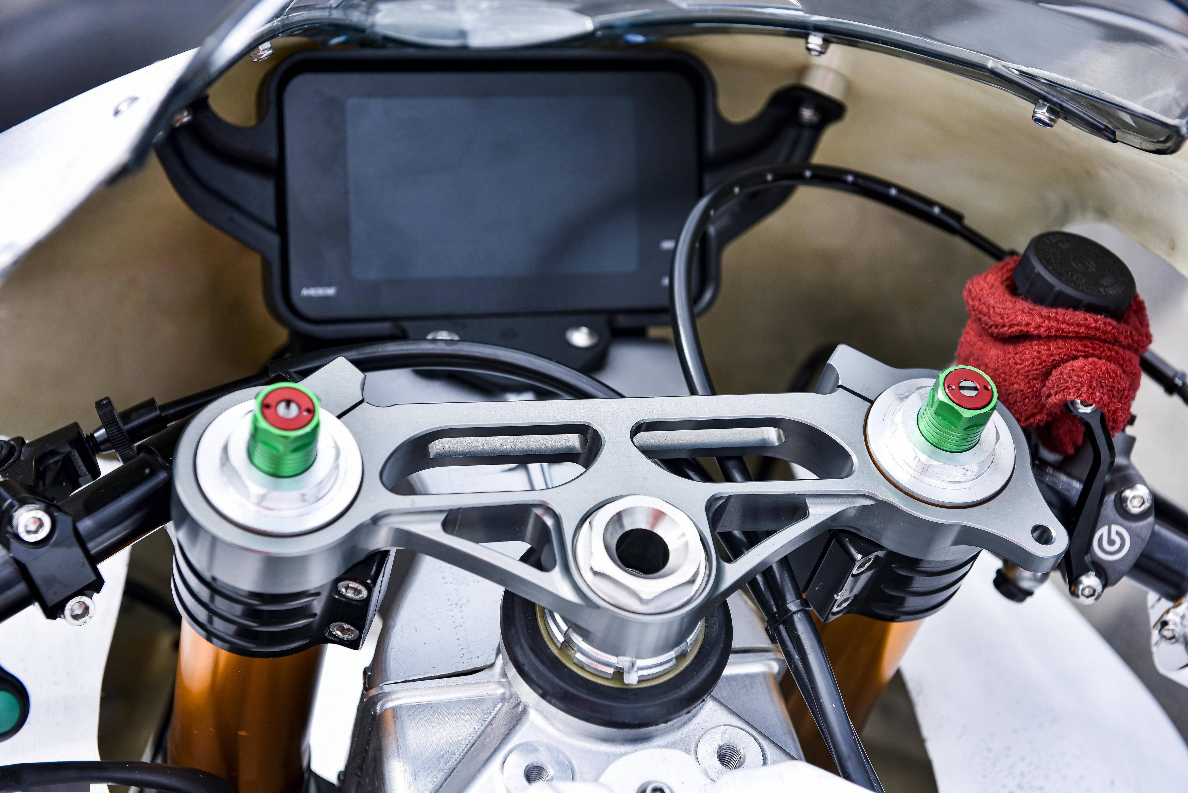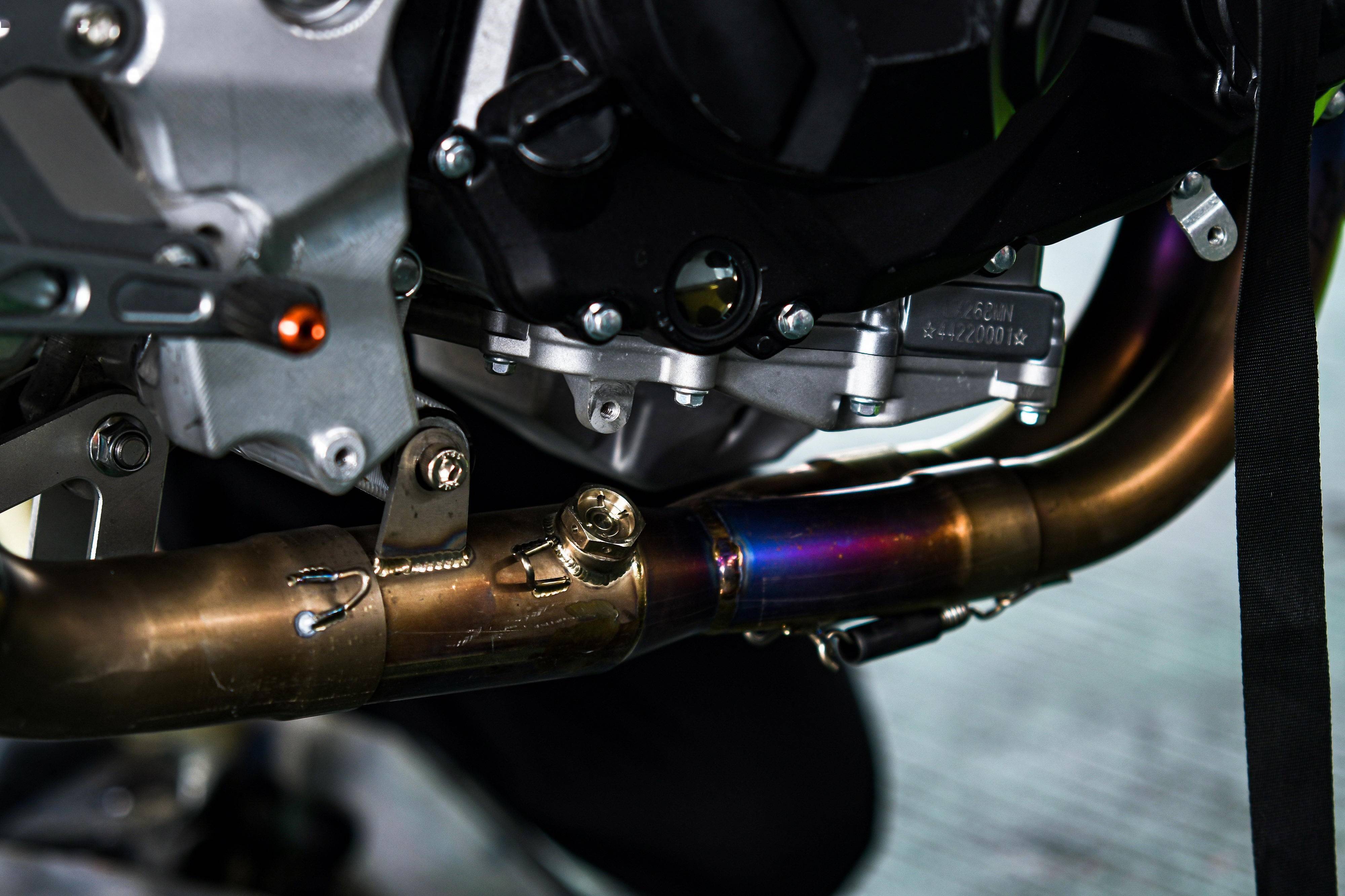 8、全段鈦合金制的排氣管,多功能的數(shù)字式儀表板,規(guī)格為 415 的傳動鏈條和齒輪,經(jīng)過后期 CNC 處理的剎車卡鉗、上下三星(前叉三角臺)等。