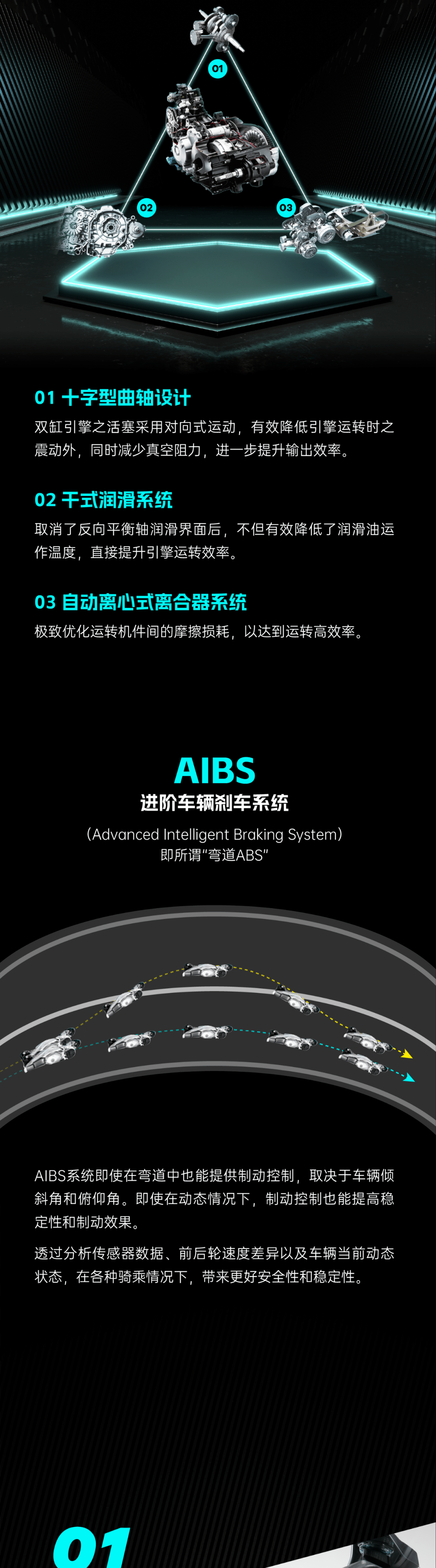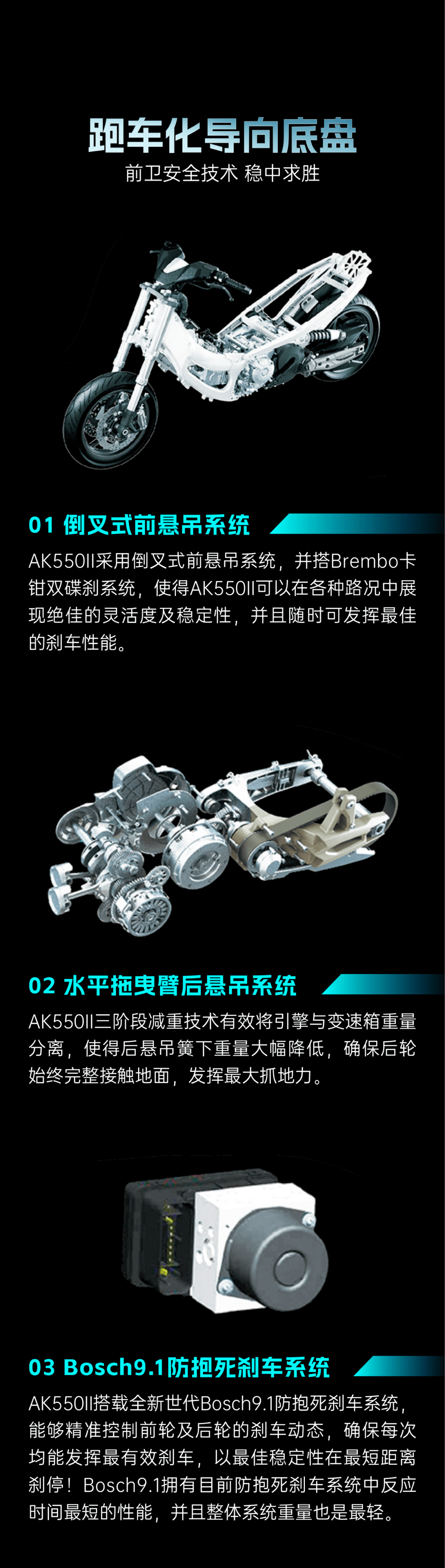 新一代AK550,主要升級(jí)了彎道ABS,這是光陽(yáng)聯(lián)合BOSCH開發(fā)的一套彎道ABS系統(tǒng)--AIBS,能夠在彎道中緊急剎車時(shí)能最大限度維持車身穩(wěn)定,更安全。