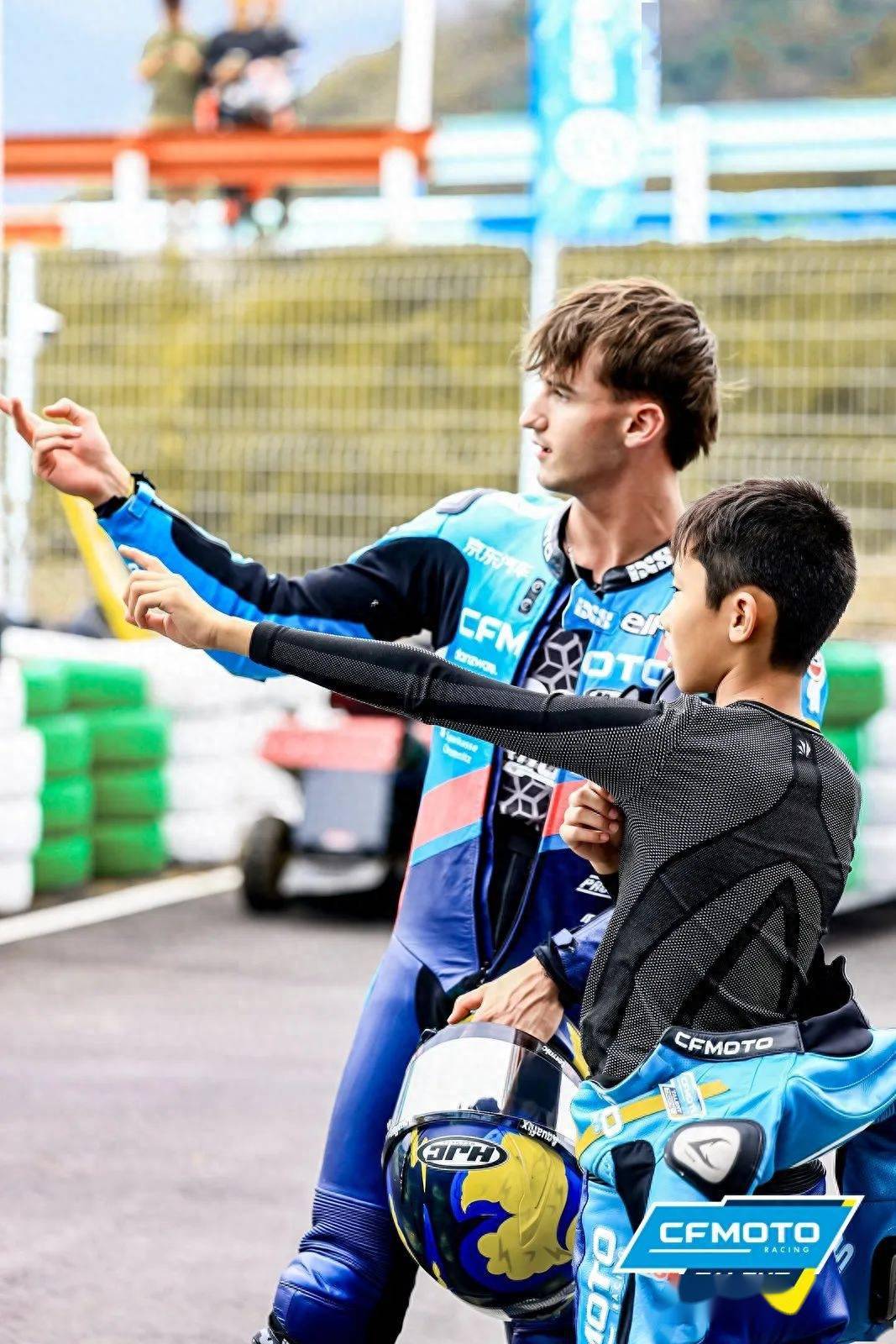 此次活動(dòng)最大的亮點(diǎn)除了小車手的表現(xiàn),當(dāng)屬CFMOTO Moto3廠隊(duì)車手Xavier Artigas、Joel Kelso,以及CFMOTO的天才車手孫圣博也來到了活動(dòng)現(xiàn)場(chǎng),與同樣懷揣著MotoGP夢(mèng)想的小車手們進(jìn)行了切磋交流。Artigas和Kelso在現(xiàn)場(chǎng)觀看小車手的比賽,也摩拳擦掌躍躍欲試。比賽間隙,他們也換上皮衣,下場(chǎng)進(jìn)行練習(xí)與飛馳圈表演,引起現(xiàn)場(chǎng)小車手與家長(zhǎng)的陣陣歡呼。毫無疑問,通過比賽選拔進(jìn)入CFMOTO Racing歐洲青訓(xùn)營(yíng)的小車手以后也有機(jī)會(huì)與Moto3車手一起培訓(xùn)。