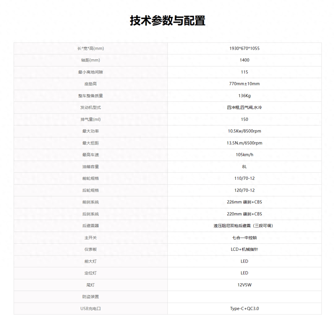 其它配置方面,正立式前叉加上預(yù)載可調(diào)雙筒后減震算是這個(gè)級(jí)別中的標(biāo)配,前后碟剎但沒有標(biāo)配ABS,而是采用了前后聯(lián)動(dòng)的CBS。不過細(xì)節(jié)上前減震加上了防塵套,標(biāo)配了側(cè)枝保護(hù)、停車駐車器、USB加Type-C充電接口以及雙閃開關(guān),細(xì)節(jié)配置還算豐富。