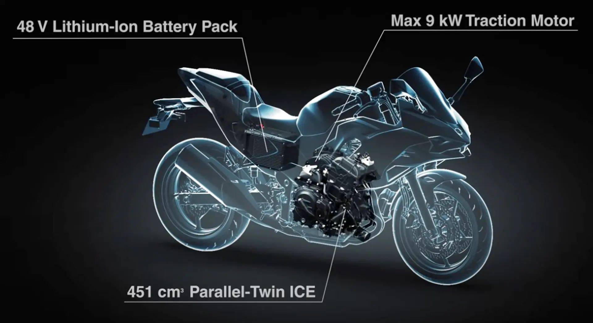 大家最關心的動力部分,Ninja 7 Hybrid搭載新設計的451c.c.雙缸引擎,單獨運行時能輸出58.3匹馬力,引擎后面則安裝了一個9千瓦(12匹馬力)的電動馬達,由安裝在座椅下方的48V鋰離子電池組提供電力,當引擎和馬達兩者相結合時,混合系統(tǒng)的最大輸出將達到68.5匹馬力。