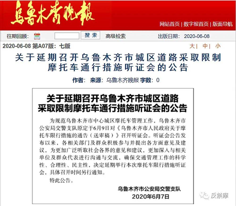 6月8日,《烏魯木齊晚報(bào)》刊登了烏魯木齊市公安局交警支隊(duì)于6月7日發(fā)布的“關(guān)于延期召開(kāi)烏魯木齊市城區(qū)道路采取限制摩托車通行措施聽(tīng)證會(huì)的公告”。
