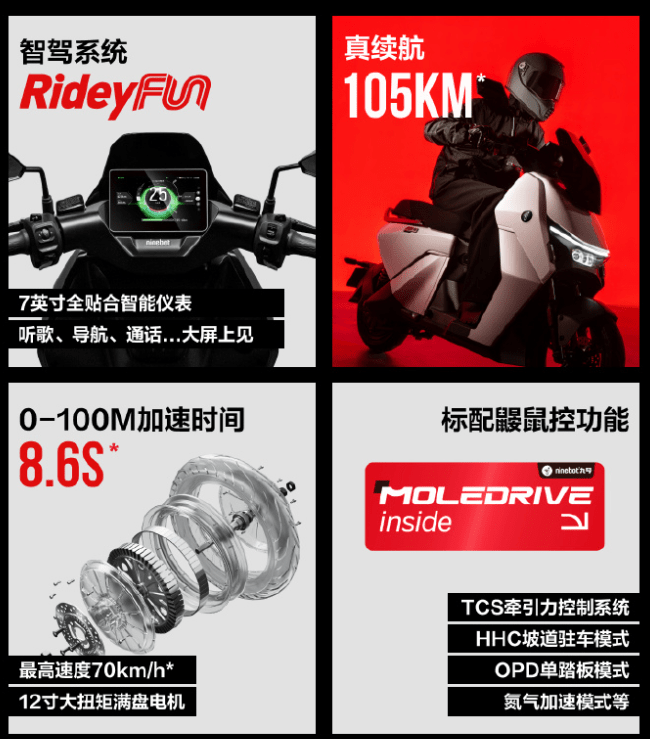 該電摩配有 48V 68Ah 鋰電池,標(biāo)稱續(xù)航 105km;搭載 2500W 九號(hào)定制無刷電機(jī),最高速 70km/h,零百公里加速 8.6 秒;標(biāo)配 20A 快充充電器,號(hào)稱 2.6 小時(shí)可從 0% 充電到 80%。