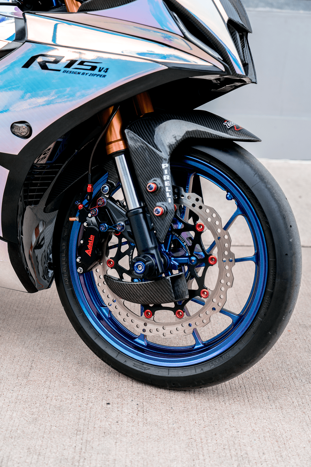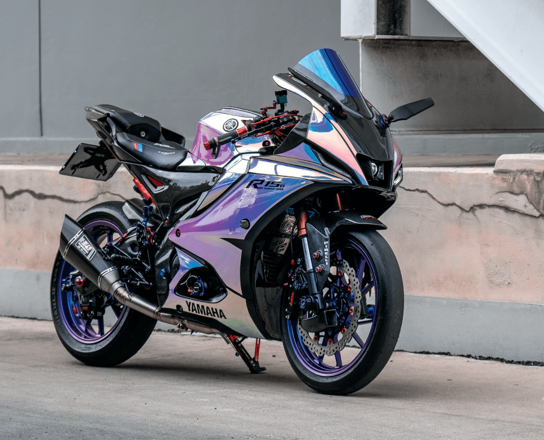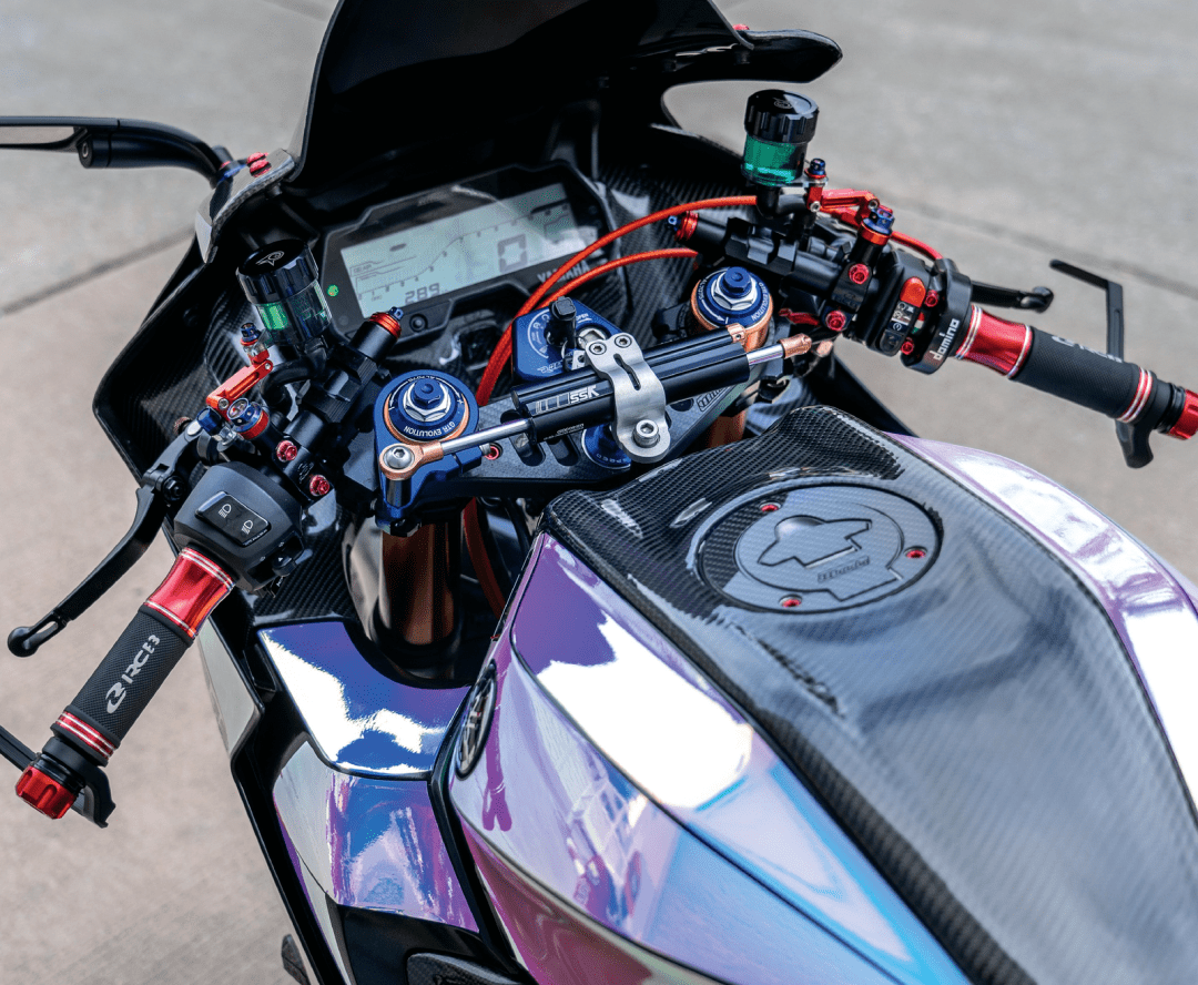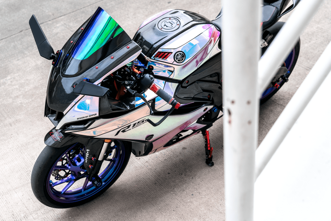 該作品采用了中國改裝品牌 Adelin 愛得利的前后剎車卡鉗,多處采用了東南亞改裝品牌 RCB 的產(chǎn)品,YSS 的后減震和方向阻尼器,Yoshimura 吉村的排氣系統(tǒng)等。而大量的碳纖維覆蓋件,以及電鍍風(fēng)格的貼花,是外部的重要亮點。