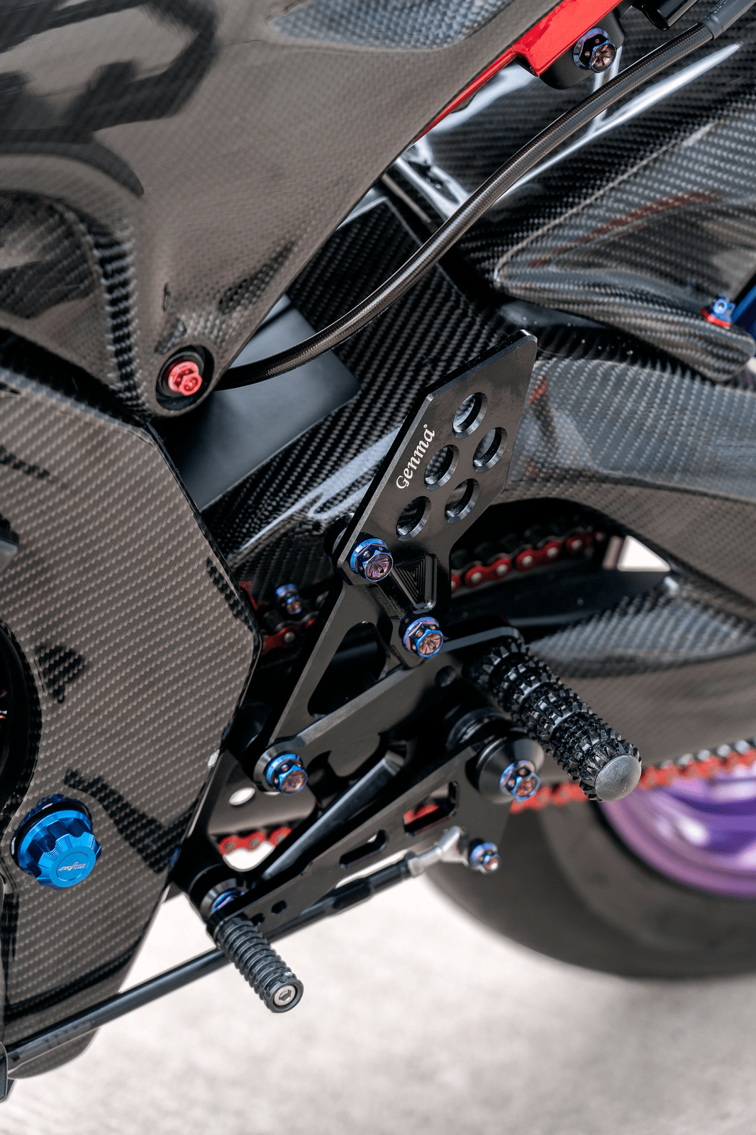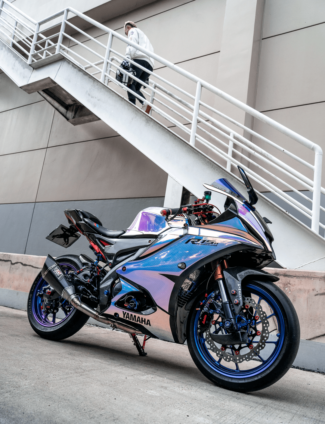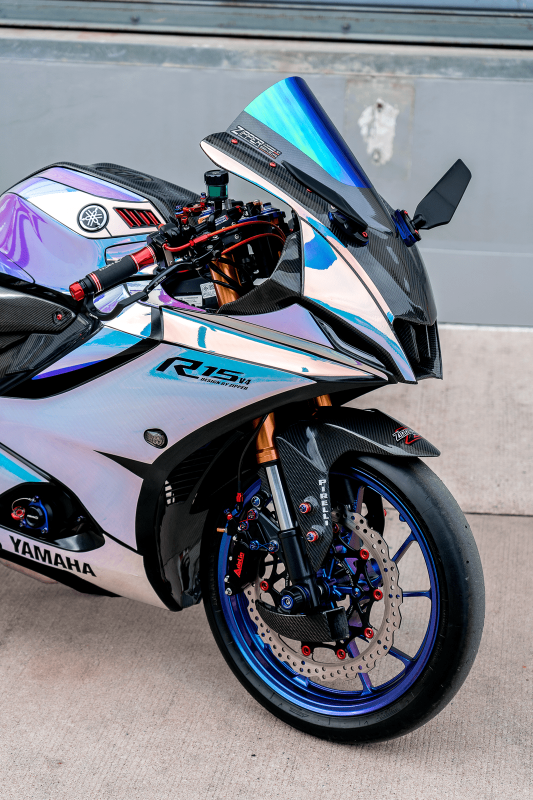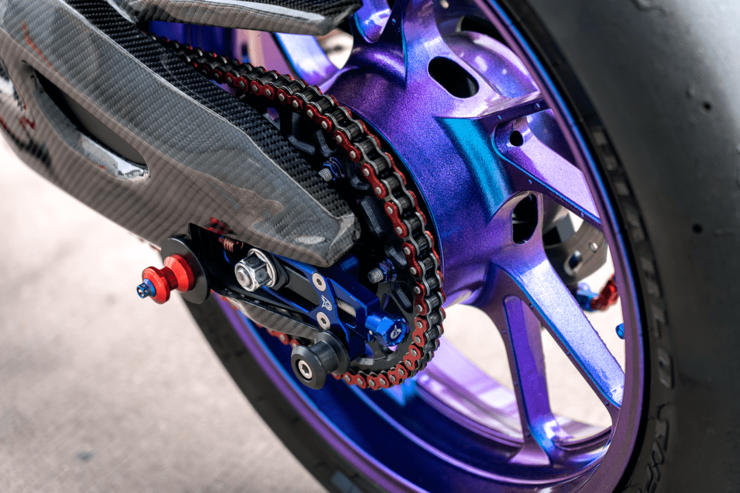 該作品采用了中國改裝品牌 Adelin 愛得利的前后剎車卡鉗,多處采用了東南亞改裝品牌 RCB 的產(chǎn)品,YSS 的后減震和方向阻尼器,Yoshimura 吉村的排氣系統(tǒng)等。而大量的碳纖維覆蓋件,以及電鍍風(fēng)格的貼花,是外部的重要亮點。