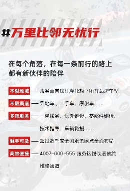 目前,錢江摩托全國服務網(wǎng)點已超過5000個,覆蓋全國30多個省市,2000余個縣區(qū),并有更多網(wǎng)點在規(guī)劃籌建中。在任意一個全國維修網(wǎng)點,錢江摩托用戶都可以享受到三包維修、零部件維修、技術指導、車輛救援等服務。緊急情況下,車主可以撥打各地服務中心24小時服務熱線,選擇就近服務網(wǎng)點提供聯(lián)保服務。