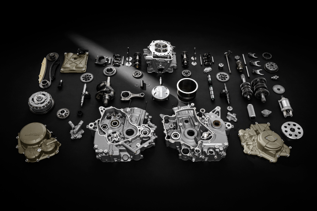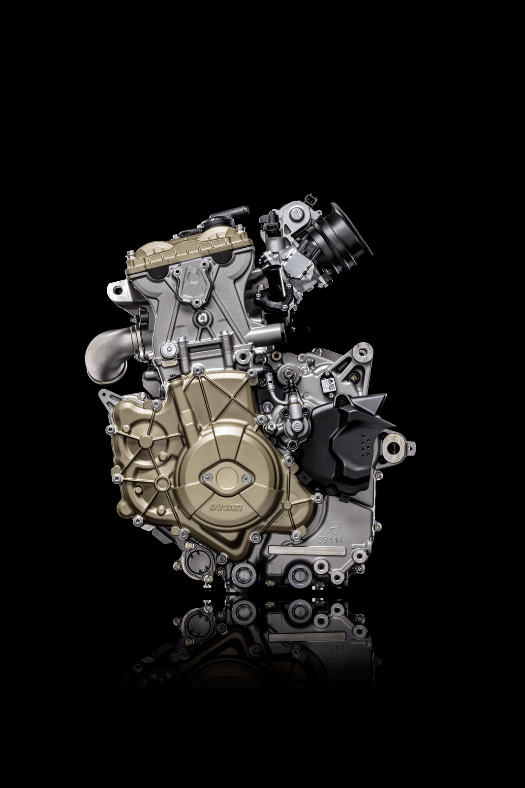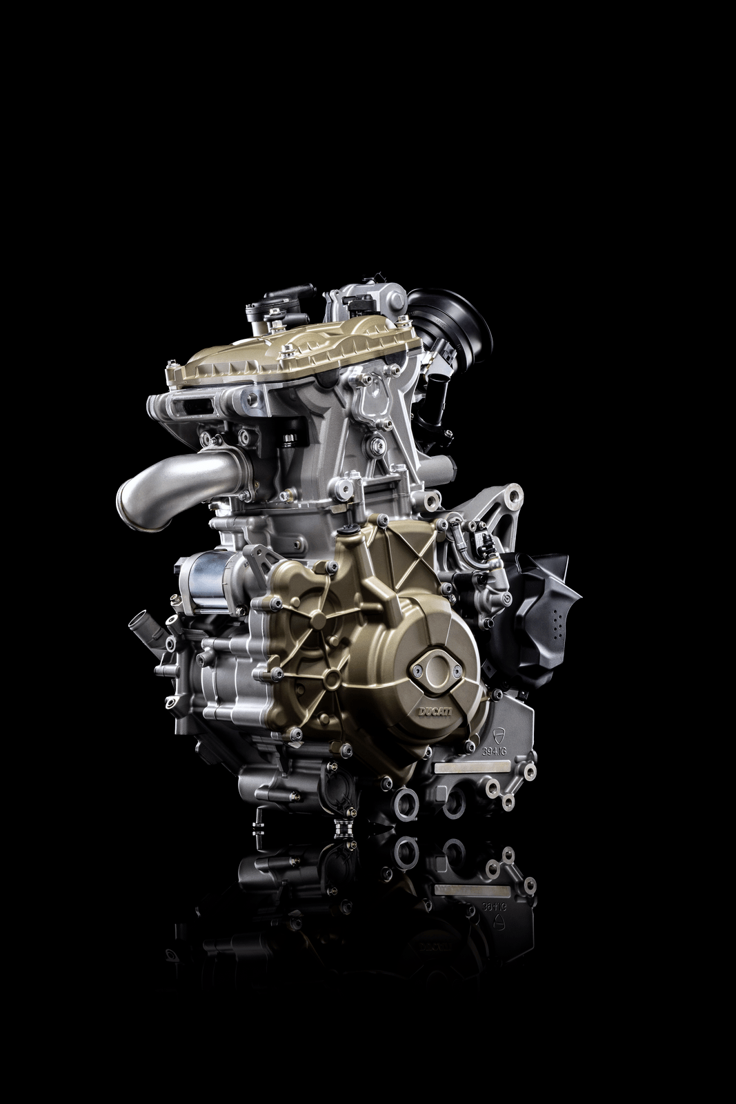 放置在曲軸側(cè)面的、兩個(gè)副軸的布局,得益于此解決方案,發(fā)動(dòng)機(jī)即使是以非常高的速度運(yùn)行,也能同時(shí)保持著與 V 型 90 度兩氣缸發(fā)動(dòng)機(jī)相當(dāng)?shù)恼駝?dòng)水平。發(fā)動(dòng)機(jī)的曲軸箱體采用鋁合金制成,而離合器、交流發(fā)電機(jī)和氣缸蓋則由鎂合金鑄造而成,兩者的結(jié)合將發(fā)動(dòng)機(jī)重量降至最低。