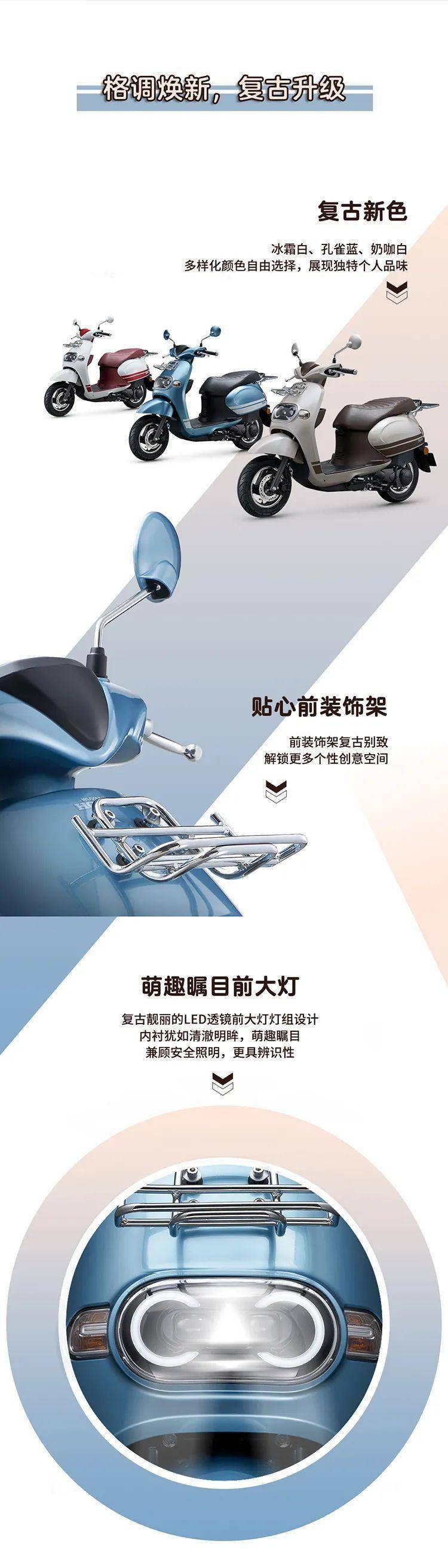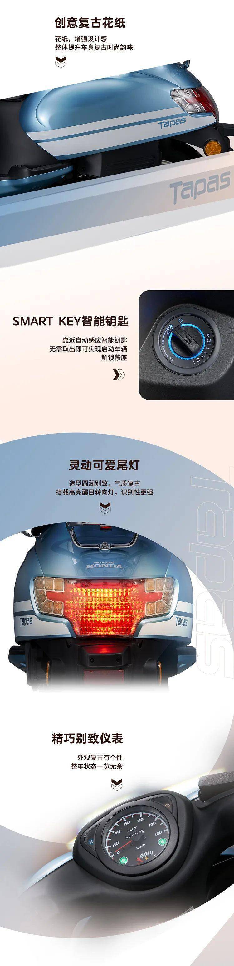 New Tapas冰霜白、奶咖白、孔雀藍(lán)的多樣化顏色可自由選擇,展現(xiàn)獨(dú)特個(gè)人品味;貼心前裝飾架造型復(fù)古別致,解鎖更多個(gè)性創(chuàng)意空間;萌趣矚目LED透鏡前大燈燈組設(shè)計(jì),內(nèi)襯猶如清澈明眸萌趣矚目,兼顧安全照明,更具辨識(shí)性;創(chuàng)意復(fù)古花紙?jiān)鰪?qiáng)設(shè)計(jì)感,整體提升車身復(fù)古時(shí)尚韻味;SMART KEY智能鑰匙,靠近自動(dòng)感應(yīng),無(wú)需取出即可實(shí)現(xiàn)啟動(dòng)車輛解鎖鞍座;靈動(dòng)可愛(ài)尾燈造型圓潤(rùn)別致,氣質(zhì)復(fù)古,搭載高亮醒目轉(zhuǎn)向燈,識(shí)別性更強(qiáng);儀表精巧別致,外觀時(shí)尚有個(gè)性;獨(dú)特造型排氣管設(shè)計(jì)復(fù)古又可愛(ài)。整體讓New Tapas騎行時(shí)更加吸睛。