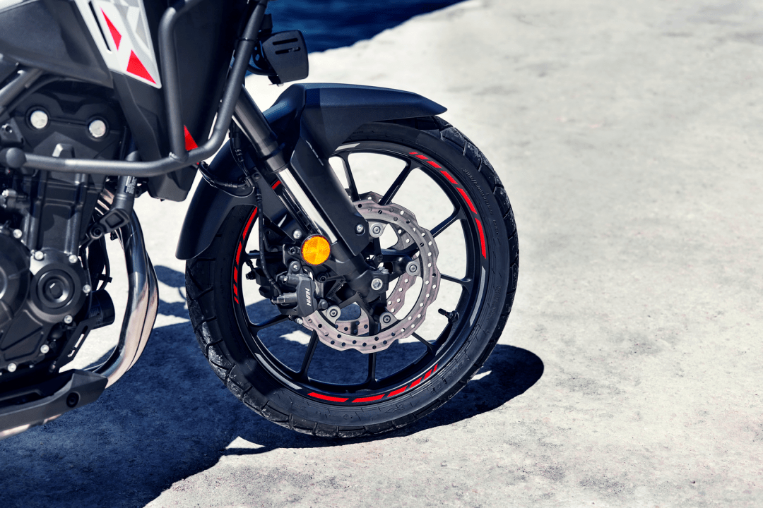 6、前 19、后 17 英寸直徑的輪框,采用了新配套的鋁合金制 Y 字型五柱式(現(xiàn)行的 CB500X 采用 Y 字型七柱式),具有更輕的重量(前輪降低了 800 克、后輪輕了 700 克);