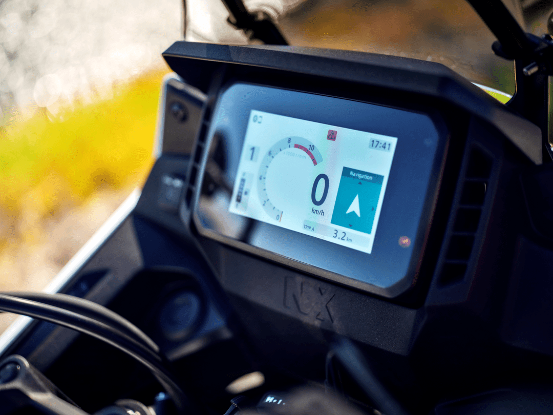 5、繼承自 XL750 Transalp 的 TFT 全彩色數(shù)字式儀表板,具有通過 Honda RoadSync 手機軟件、與智能電話連接的功能;