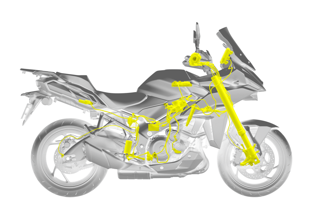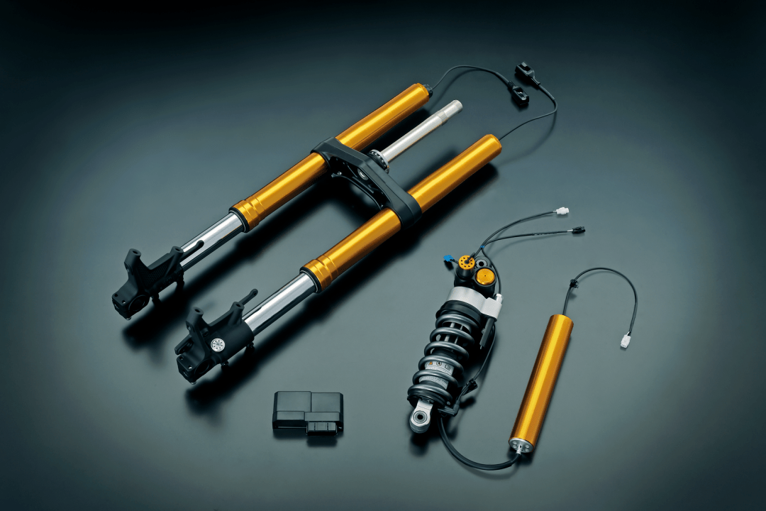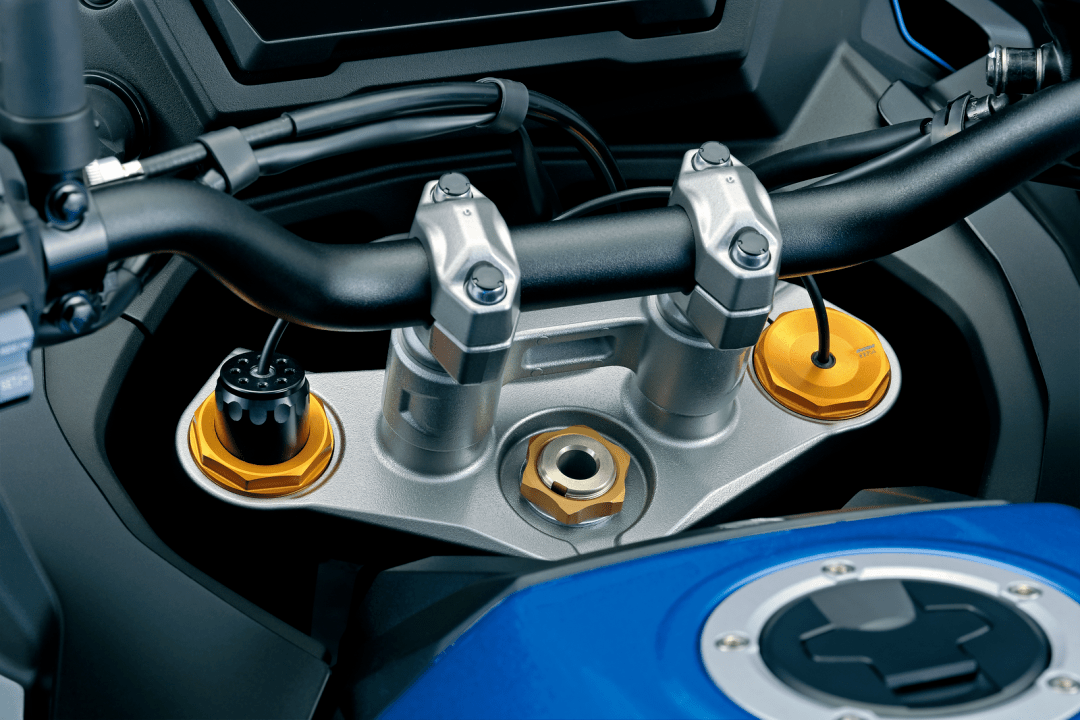 7、新的 GSX-S1000GX 是第一個配備了 SAES(Suzuki Advanced Electronic Suspension,Suzuki 先進電子懸掛)電子懸掛系統(tǒng)的車型,懸掛系統(tǒng)的前后行程均為 150 mm(GT 版懸掛系統(tǒng)的行程為前 120 mm、后 130 mm)。該懸掛系統(tǒng)以 Showa(日立 Astemo)的 EERA 為基礎(chǔ),專為 GSX-S1000GX 而設(shè)計,其基本工作原理是透過六軸 IMU 和車輪速度傳感器、前后懸掛內(nèi)所集成的高精度行程傳感器向 ECU 發(fā)送的信息,系統(tǒng)根據(jù)預(yù)設(shè)的當前騎行條件,對懸掛系統(tǒng)作出自動調(diào)整,確定最佳阻尼、從而實現(xiàn)一個接近于理想的騎行質(zhì)量;