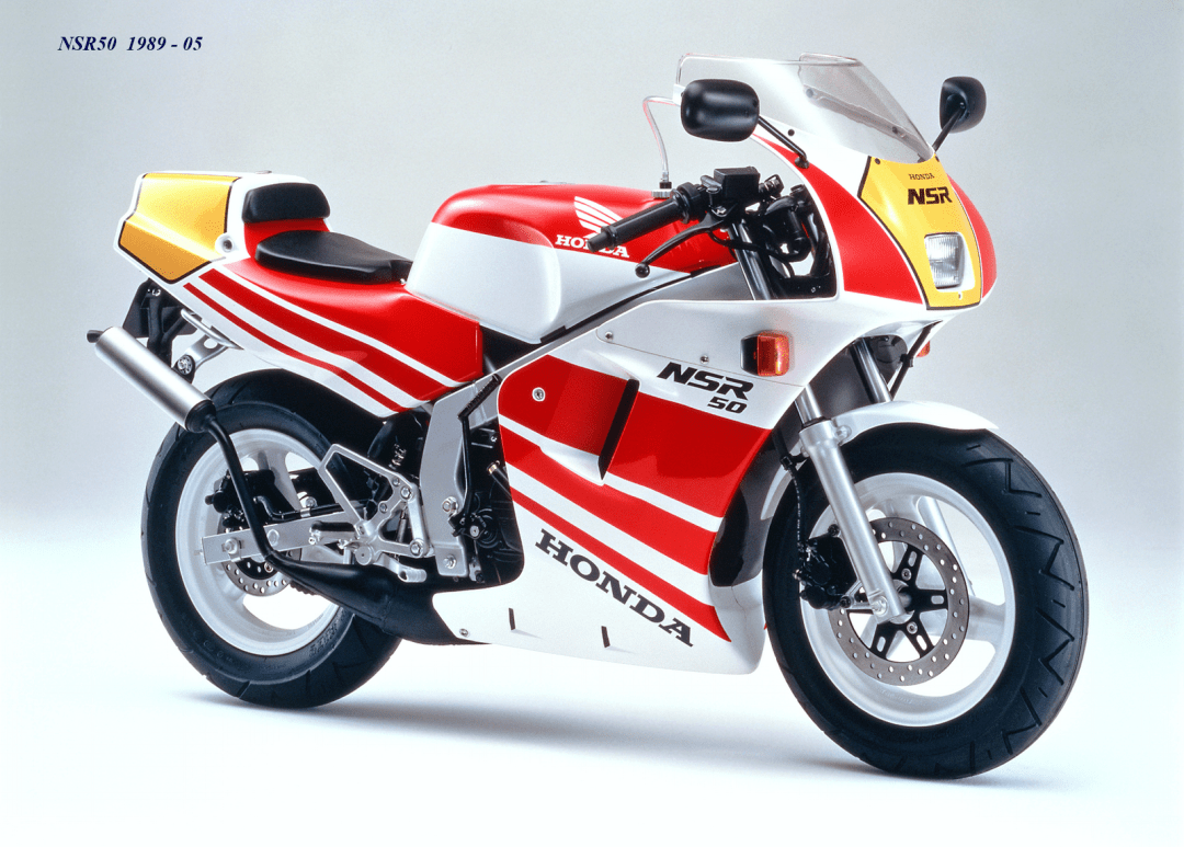 1987 年五月首次發(fā)布的 NSR50(工廠編號(hào) AC10),搭載一副工廠編號(hào)為 AC08E 的水冷兩沖程單氣缸的發(fā)動(dòng)機(jī),缸徑、行程為 39 mm x 41.4 mm,排氣量 49 cc,六檔的變速齒輪箱,最大動(dòng)力輸出 7.2 匹。車體采用一副鐵制的雙翼樑式車架,有著 NSR250 初代風(fēng)格的全車整流罩,前后碟式的制動(dòng)系統(tǒng),直徑為 12 英寸的前后車輪,全車整備重量 85 公斤。