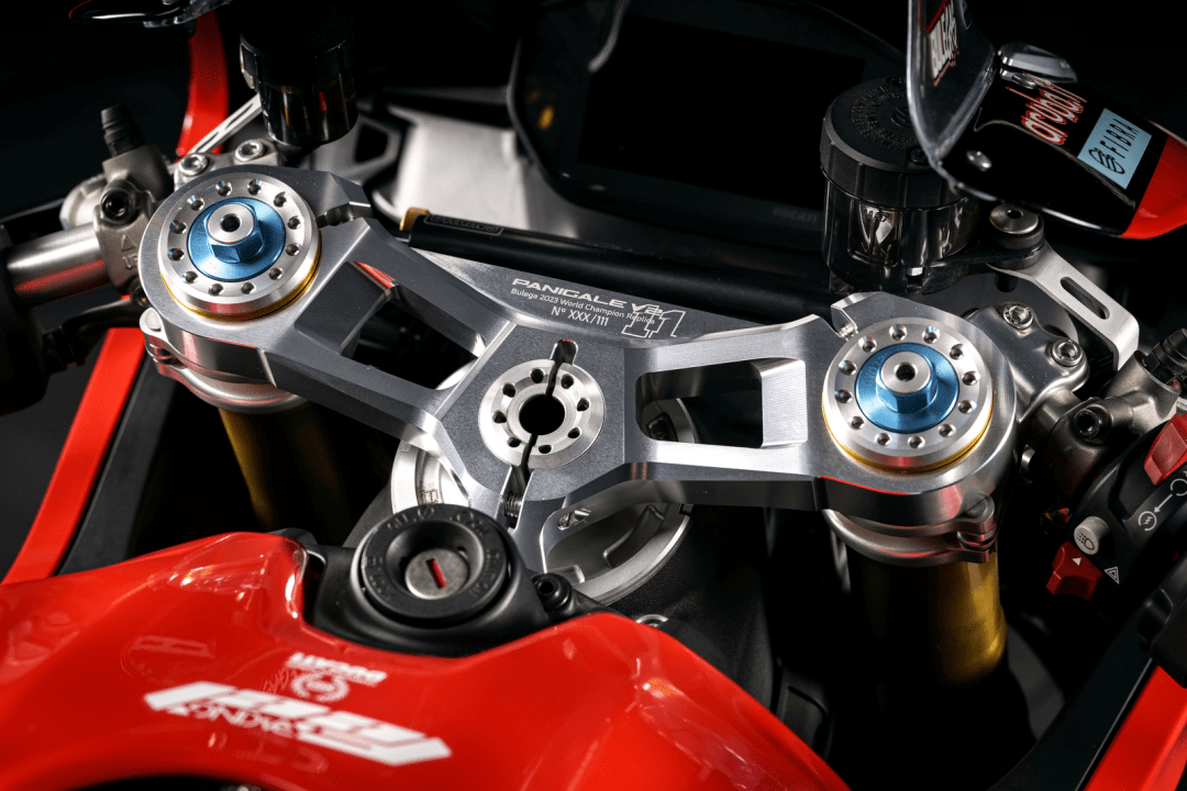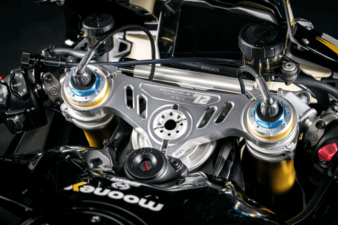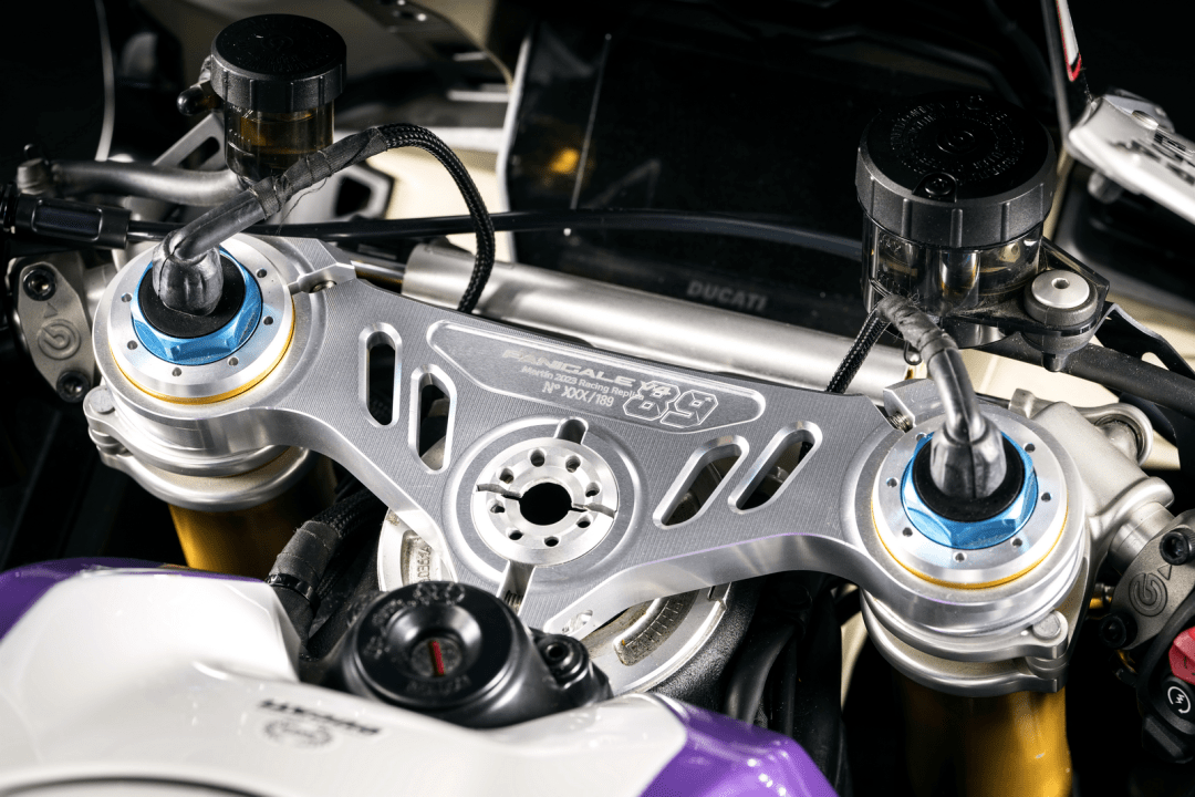 此外,每輛 Panigale 2023 Replica 復(fù)制版車型的上三星(前叉上三角臺(tái))都刻有限量的編號(hào),油箱上有車手的原始簽名、并用一層透明清漆進(jìn)行保護(hù),隨附有木盒包裝的真品證書(shū)等。