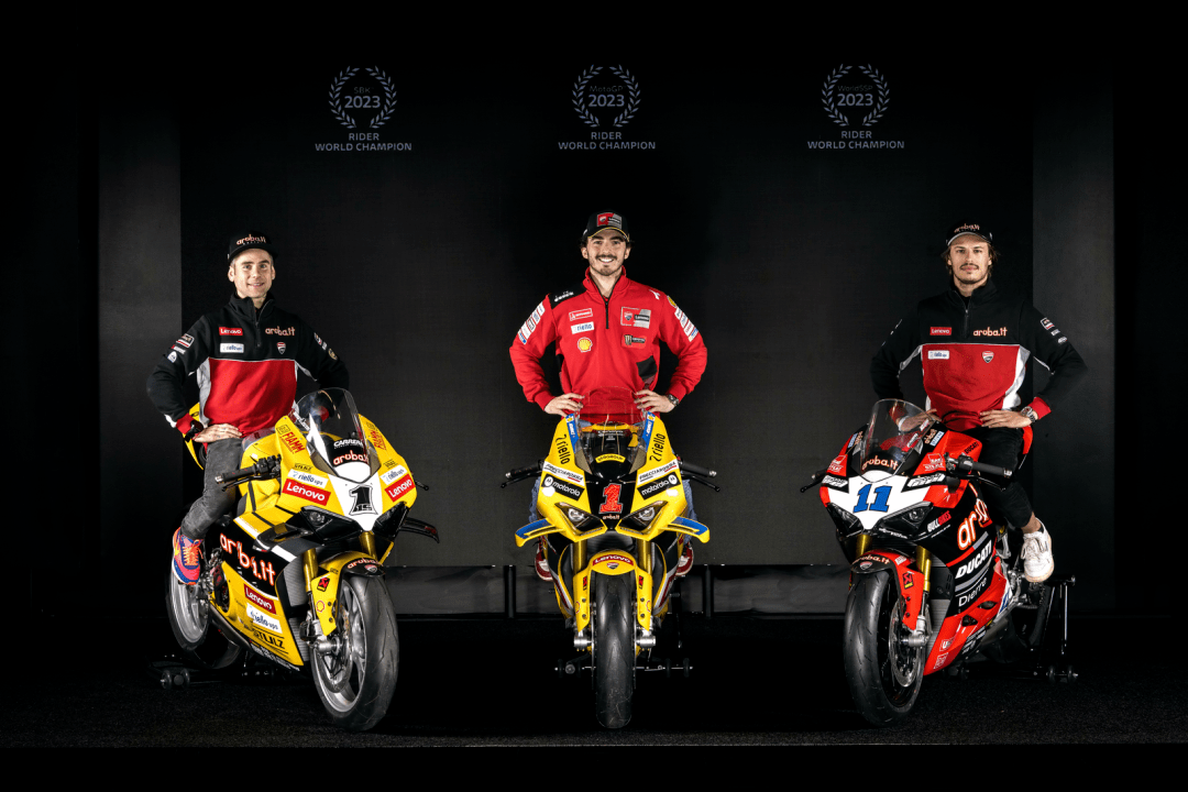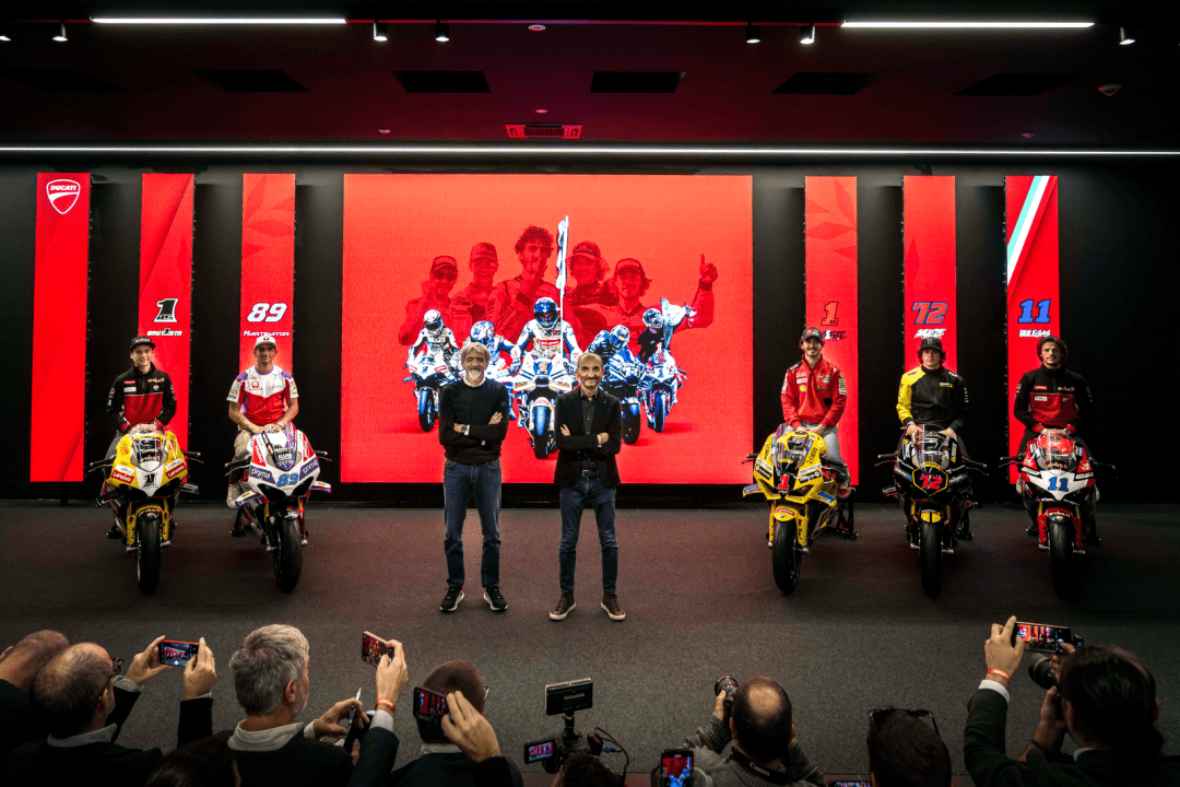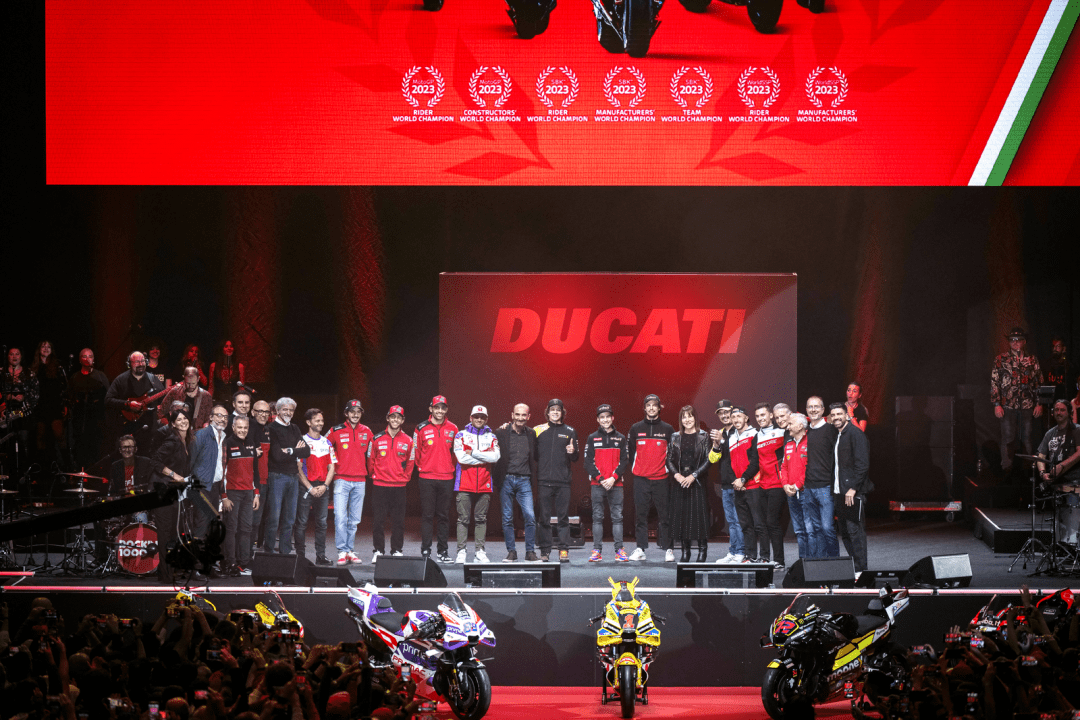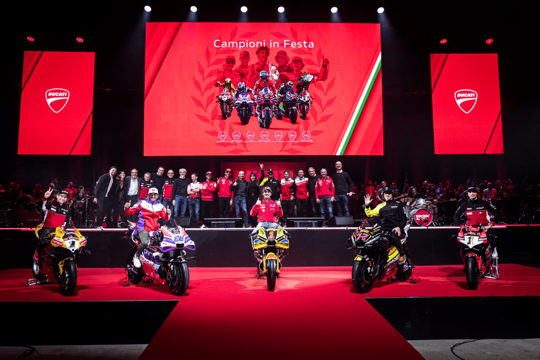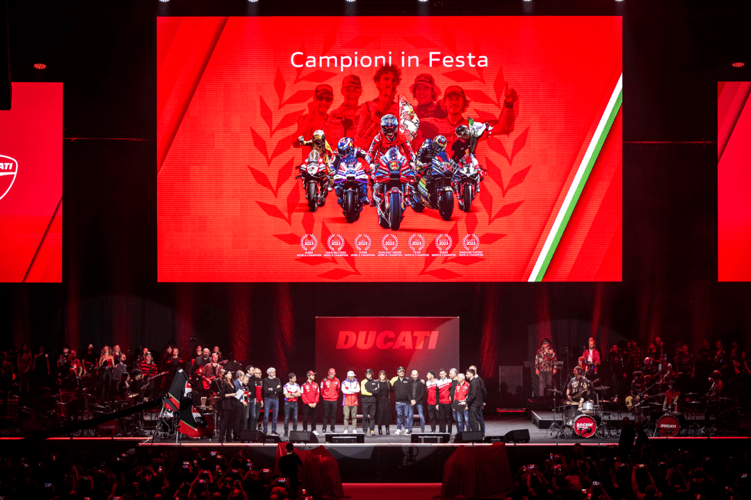 十二月 15 日,意大利博洛尼亞 Unipol Arena 競(jìng)技場(chǎng),Ducati 杜卡迪舉辦了名為 Campioni in Festa 的晚會(huì),以慶祝他們?cè)?2023 賽季獲得了大豐收 —— 在 2023 賽季,杜卡迪歷史性地同時(shí)拿下了 FIM GP 世界錦標(biāo)賽(FIM Grand Prix World Championship,也就是 MotoGP)最高級(jí)別 MotoGP、FIM 超級(jí)跑車世界錦標(biāo)賽(FIM Superbike World Championship,也就是 WorldSBK)最高級(jí)別 WSB 兩項(xiàng)世界大賽的三料世界冠軍(車手、制造商、車隊(duì)年度積分總冠軍),以及歷史性地首次奪得 WorldSBK 的 WorldSSP(WSSP600)級(jí)別雙料世界冠軍(車手世界冠軍、制造商世界冠軍)。