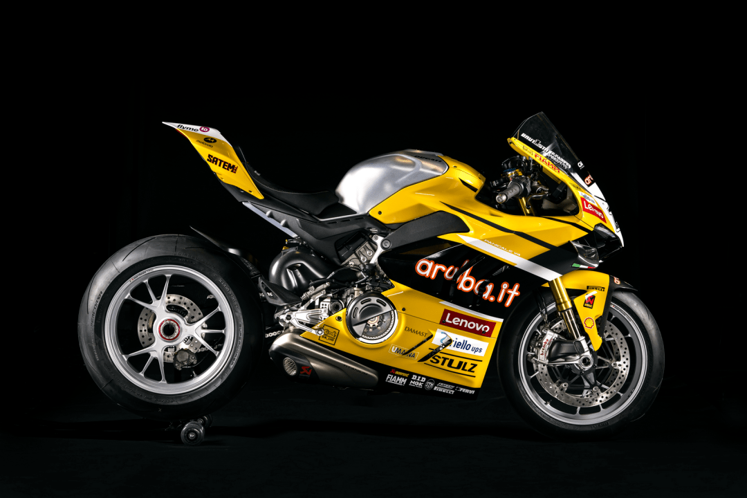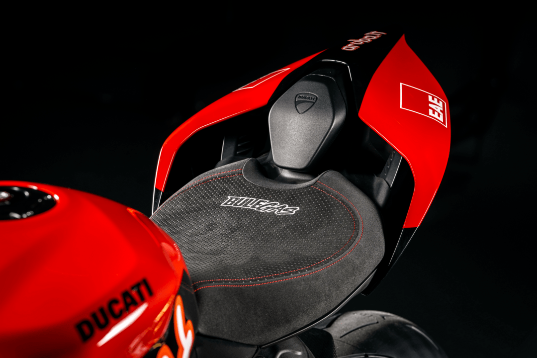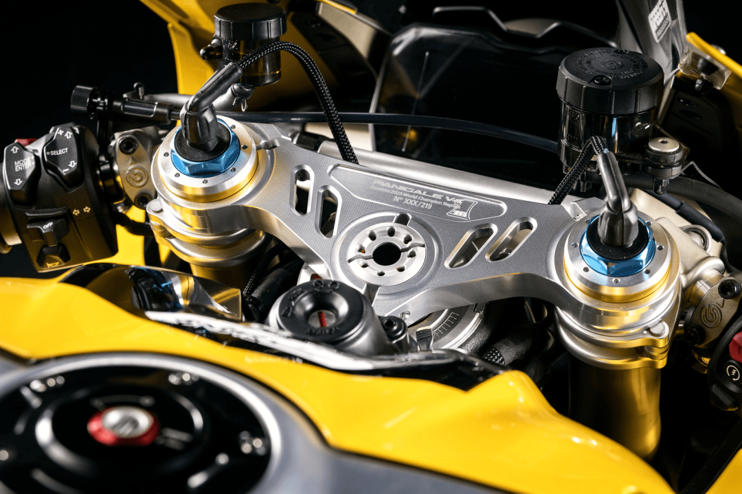 基于 Panigale V2 的復(fù)制版同樣經(jīng)過(guò)了強(qiáng)化,標(biāo)配了 Ohlins 的懸掛系統(tǒng)和轉(zhuǎn)向阻尼器,可將峰值馬力輸出提高 2.5%,最大扭矩提高 2%、并將重量降低了 5 公斤的 Akrapovic 賽車消聲器,鋰電池,多處的碳纖維組件等。