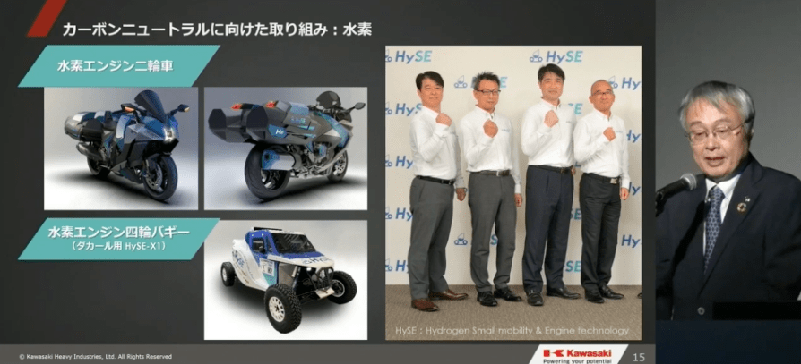 川崎早在幾年前就已經(jīng)亮相過氫能源發(fā)動機,而以NINJA H2四缸增壓發(fā)動機為基礎(chǔ)改造的氫能發(fā)動機也在2023日本移動展上展出。川崎也于2023年發(fā)表了NINJA E-1、ZE-1、NINJA 7 HYBRID等三款純電和混合動力新車。另外2024年日本HySE(型氫氣動力出行和發(fā)動機技術(shù)研究協(xié)會)也將與TOYOTA攜手,以氫能源動力賽車出戰(zhàn)達(dá)喀爾拉力賽,所使用的發(fā)動機就是以川崎NINJA H2平臺而開發(fā)的四缸氫能源發(fā)動機。