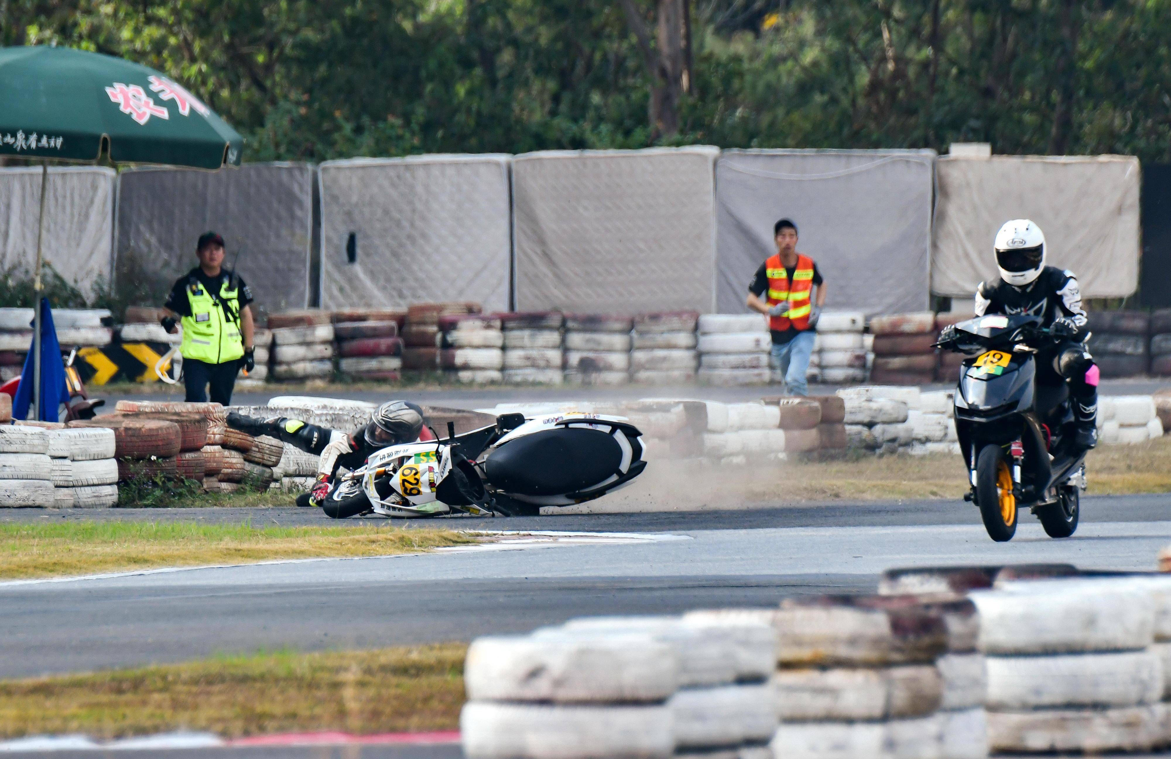 重新發(fā)車(chē)、原定 8 圈的比賽被縮減為 6 圈。前面,是 A 組四位車(chē)手的較量,而薛文俊與慕容志釗兩人是從起步一直拼到了最后沖線,后面的不遠(yuǎn)處,胡通明與鄺繼亨的肉搏戰(zhàn)也同樣是在磕磕碰碰中進(jìn)行;B 組的混戰(zhàn)、也讓人看得眼花繚亂。最終,慕容志釗奪得了第一節(jié)比賽的勝利,領(lǐng)先了大半場(chǎng)的比賽、最后一圈被慢車(chē)擋了一下的薛文俊奪得了第二;最后一個(gè)彎雙方碰了一下的胡通明與鄺繼亨,分別獲得了第三、第四。