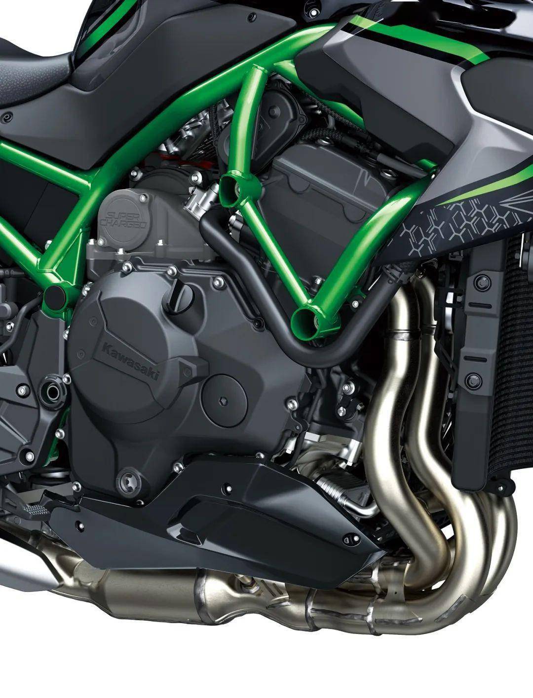 這臺(tái)暴力美學(xué)的典范之作,核心在于那顆采用了機(jī)械增壓的并列四缸發(fā)動(dòng)機(jī)。經(jīng)過(guò)增壓后,進(jìn)氣壓力進(jìn)一步提高,在相同時(shí)間內(nèi)壓入更多的氣體,榨取更多的能量。川崎將之稱為“第二代平衡機(jī)械增壓發(fā)動(dòng)機(jī)”,因?yàn)槿~輪、進(jìn)氣系統(tǒng)、排氣系統(tǒng)、活塞、汽缸、汽缸頭、曲軸、凸輪軸、扼流閥體等都是新的設(shè)計(jì),齒輪比也作了修改,因而在低轉(zhuǎn)速時(shí),獲得了比第一代更強(qiáng)的扭矩輸出。