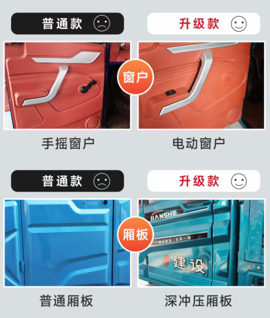 此外,建設(shè)電三半封閉車型還加入了汽車同款電動升降窗戶,車輛使用體驗更勝一籌。車廂廂板更新為深沖壓工藝,一體性更強,使用強度擁有明顯提升。