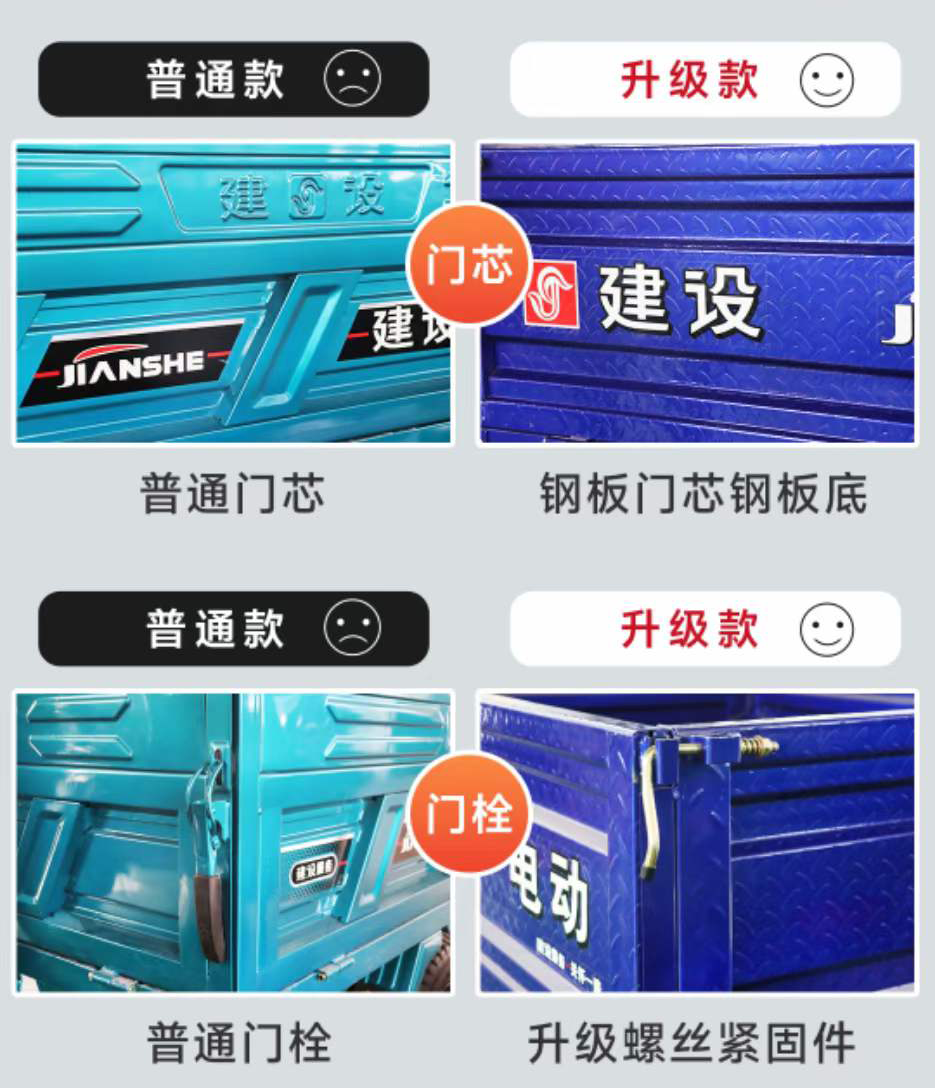 貨運三開使用場景相對電動兩輪車、休閑三輪車更為惡劣。建設(shè)電三通過對車身重要部件5大升級,實現(xiàn)車輛全場景使用。
